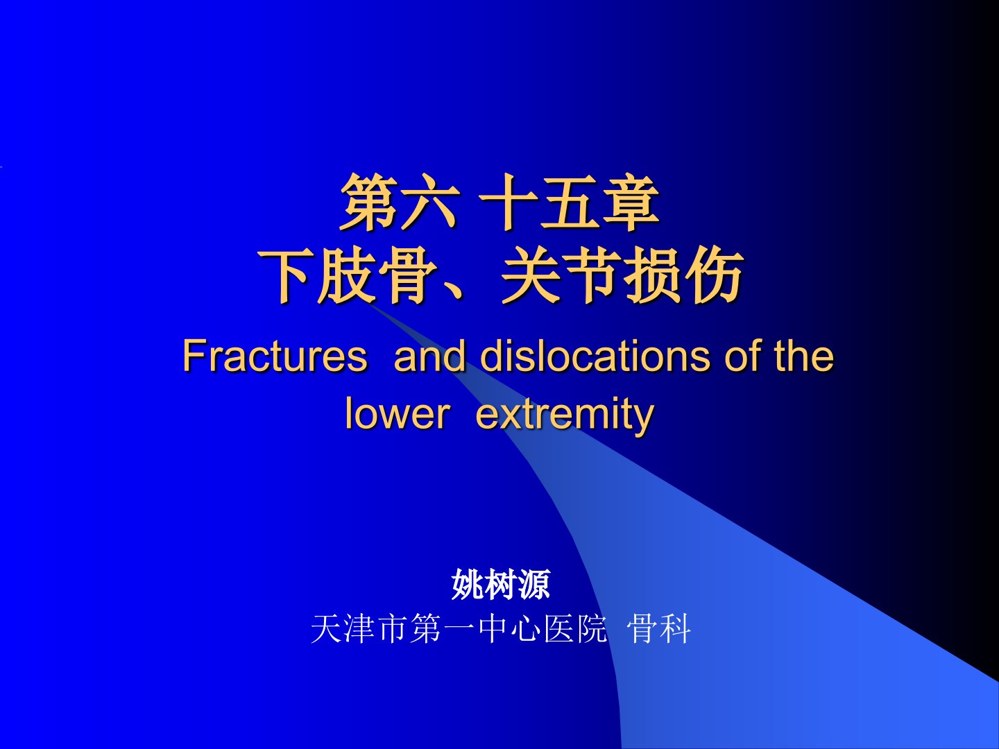 第六十五章下肢骨、关节损伤Fracturesanddislocationsofthelowerextremity姚树源天津市第一中心医院骨科第一节髋关节脱位DislocationofHipJoint骨性结构稳定(杵臼)髋关节囊及韧带分类前脱位头在Nelaton线前后脱位头在Nelaton线后中心脱位头穿破臼底一、髋关节后脱位(85%~90%)脱位机制在髋关节处于屈曲(90°)内收位时,股骨有轻度内旋,当膝部遭受暴力,沿股骨轴向上传,股骨头即冲破关节囊后下的薄弱处,脱位在后侧。分类(Epstein五型)I型单纯后脱位,或合并小片骨折Ⅱ型合并髋臼后缘一大块骨折Ⅲ型合并髋臼后缘粉碎性骨折Ⅳ型合并髋臼...