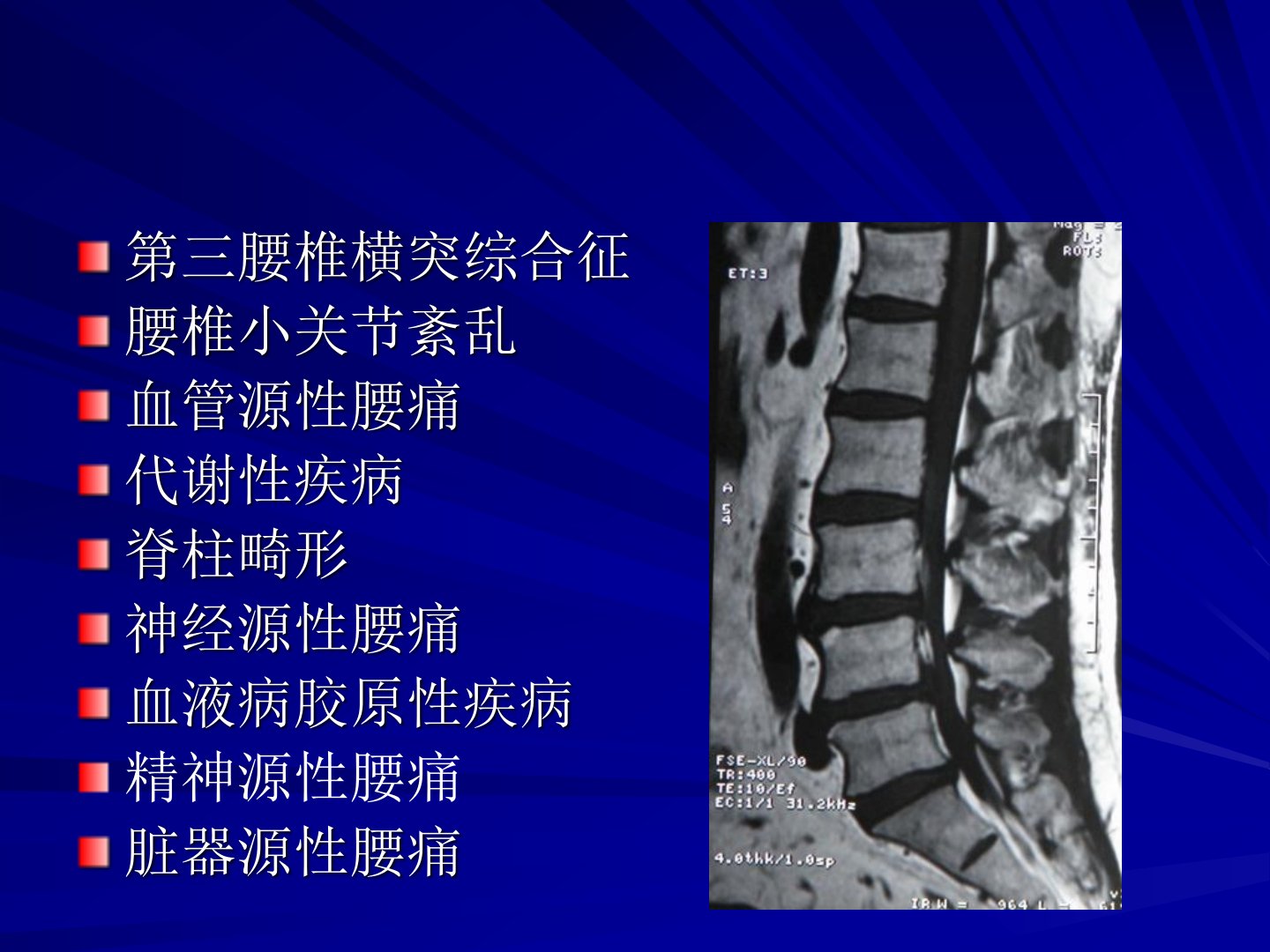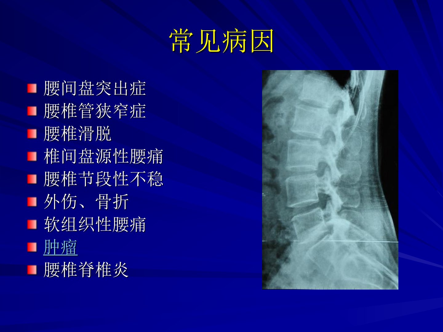 下腰痛病因多样包括肿瘤、腰椎结构异常(如第三腰椎横突综合征、腰椎小关节紊乱)、血管源性、代谢性、脊柱畸形、神经源性、血液病、胶原性疾病、精神源性、脏器源性及腰间盘突出症等。腰间盘突出症中椎间盘由纤维环、髓核、软骨终板构成其神经支配与疼痛相关。疼痛产生机制涉及机械压迫分型包括膨出、突出、脱出、游离损伤机制涉及神经根传导特性损害等。临床表现有腰痛、坐骨神经痛、马尾综合征等。影像学检查可显示脊柱侧弯、椎间隙变窄等。诊断需鉴别腰椎管狭窄、腰椎结核等疾病。治疗分非手术(卧床休息、牵引、按摩、药物等)和手术(常规、微创小切口、间盘镜、显微镜等术式)两种。此外还介绍了腰椎管狭窄、椎间盘源性腰痛、腰椎节段性不稳等相关疾病的发病机制、临床表现、诊断及治疗方法。