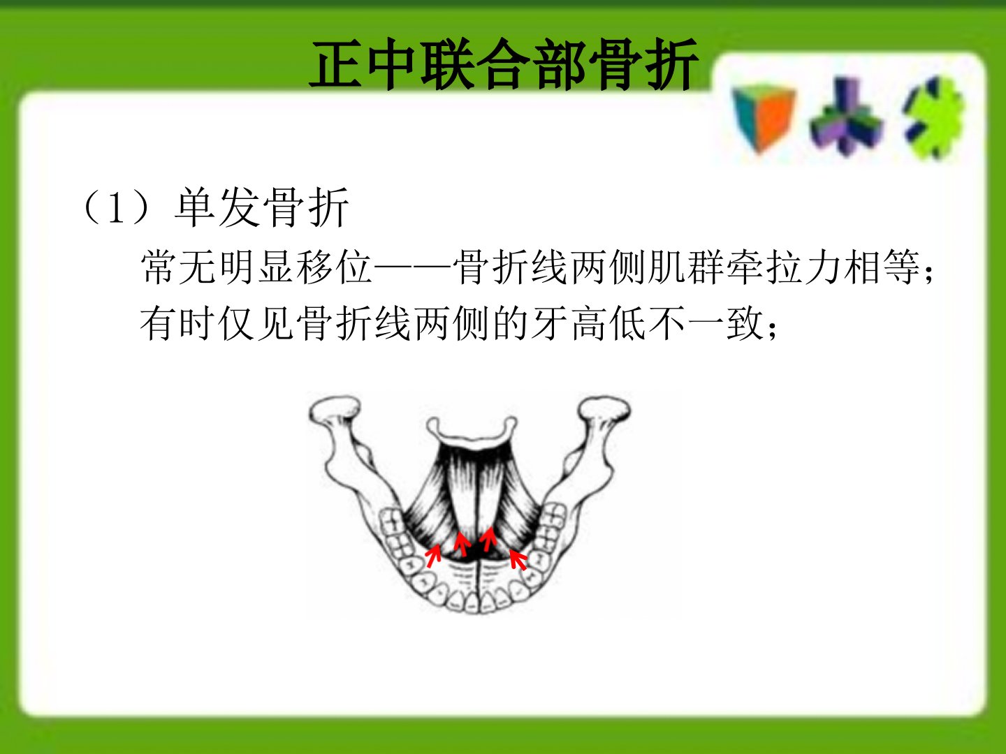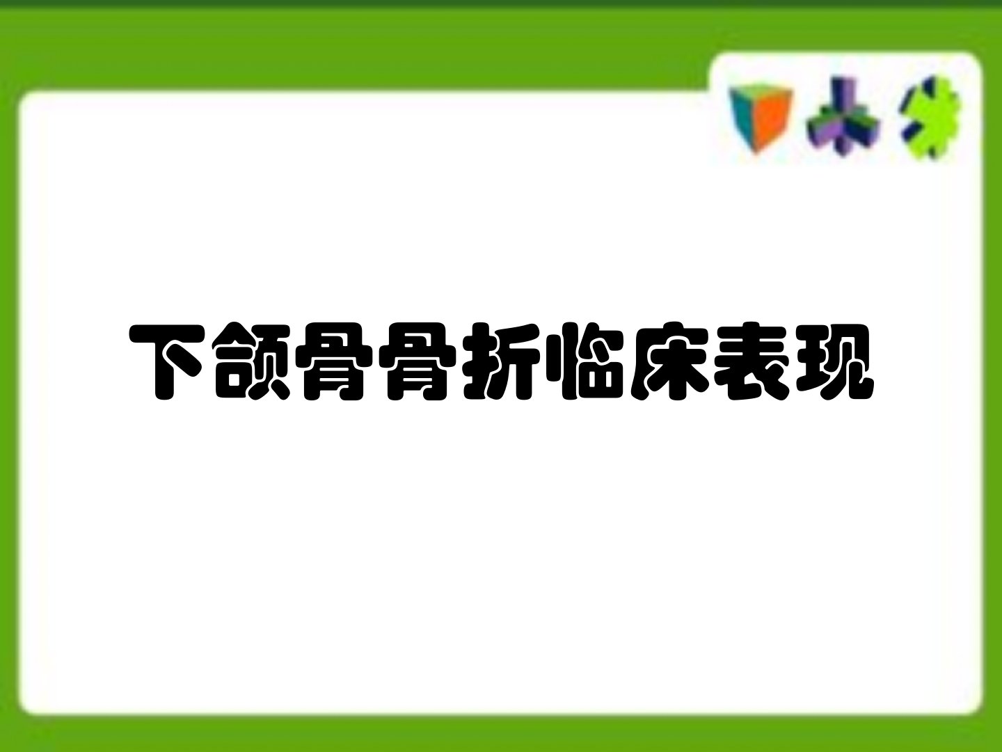 下颌骨骨折临床表现多样:正中联合部单发骨折常无明显移位两侧双发骨折则正中骨折段后下方退缩粉碎性骨折或有骨质缺损时两侧骨折段向中线移位可能导致舌后坠、呼吸困难甚至窒息;颏孔区单侧骨折时前骨折段向下偏外侧移位后骨折段向上偏内侧移位双侧骨折则后骨折段上移前骨折段下后移位可能导致颏部后缩及舌后坠;下颌角骨折段可能不移位或发生特定方向移位;髁突单侧骨折时髁突向前内方移位双侧骨折则下颌不能前伸可能伴脑震荡。此外还有咬合错乱、牙龈及粘膜撕裂、骨折段异常动度、感觉异常(如下唇麻木)、功能障碍(如张口受限)、骨折附近软组织出血或肿胀等表现。