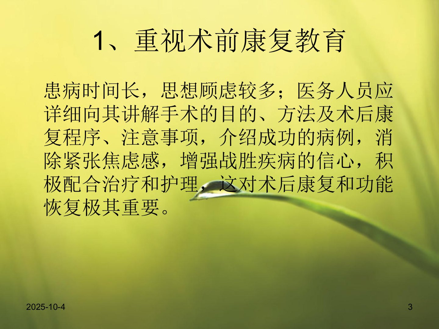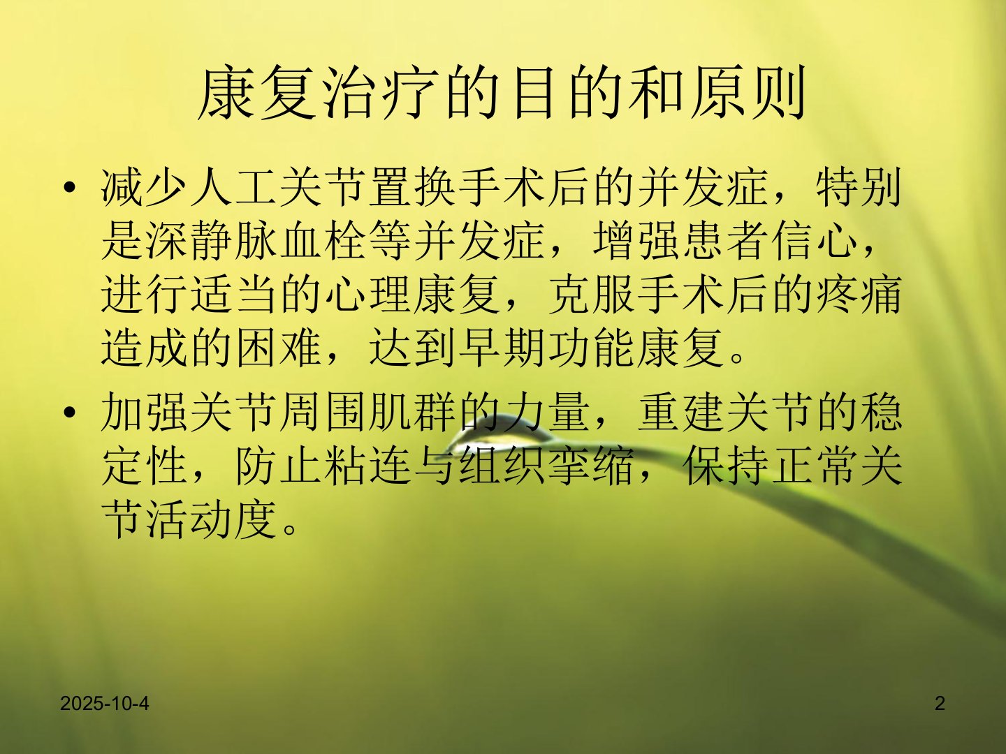 全膝关节置换术后康复治疗旨在减少并发症、增强患者信心、实现早期功能康复。具体包括:1术前康复教育:详细讲解手术目的、方法及术后康复程序消除患者紧张焦虑感增强信心。2术后康复准备:指导使用助行器配备床边坐便椅使用充气治疗仪防血栓以及使用关节连续被动活动器(CPM)进行膝关节被动活动。3术后康复方案:手术日:抗感染、抗凝、抬高患肢、深呼吸练习、主动肌肉收缩放松练习。术后12天:控制水肿、抗感染、抗凝进行股四头肌练习使用充气治疗仪适当下地活动。术后37天:继续控制水肿等治疗进行CPM练习逐渐增加行走距离和负重加强下肢肌肉练习。术后8天2周:继续CPM练习、踝泵练习等病人能独立完成简单日常生活活动进行双上肢和腰背肌力量练习。术后3周12周及以后:逐步进行髌骨活动、独立行走、上下台阶、伸膝屈膝练习、平衡功能和本体感觉练习等逐渐恢复日常生活活动和体育活动避免剧烈运动。4推荐运动项目:给出最好、比较好、需小心选择及应避免的运动。