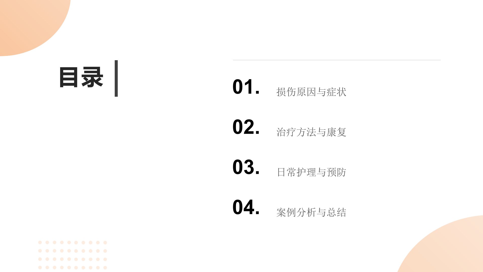 膝关节前十字韧带损伤护理摘要膝关节前十字韧带损伤原因多样包括运动损伤、意外事故、年龄及职业因素等。症状表现为疼痛、肿胀、活动受限、关节不稳定及肌肉萎缩。诊断需结合病史询问、体格检查、影像学检查、实验室检查及关节镜检查。治疗方法包括保守治疗(冰敷、加压包扎等)、康复治疗(物理治疗、运动疗法等)、营养支持、手术治疗及药物治疗。康复计划分阶段进行早期以减轻疼痛和肿胀为主随后进行物理治疗和运动疗法定期复查以调整计划。康复中需保持正确姿势避免剧烈运动遵循计划并注意营养补充。日常护理需保持适当体重避免剧烈运动加强肌肉训练佩戴护具注意保暖。预防措施包括加强肌肉训练、避免过度疲劳、佩戴护具、保持良好习惯及加强安全意识。案例分析需关注患者信息、损伤原因、程度、治疗方法及康复过程。护理要点为早期诊断、制动休息、冰敷、抬高患肢、康复训练及定期复查。