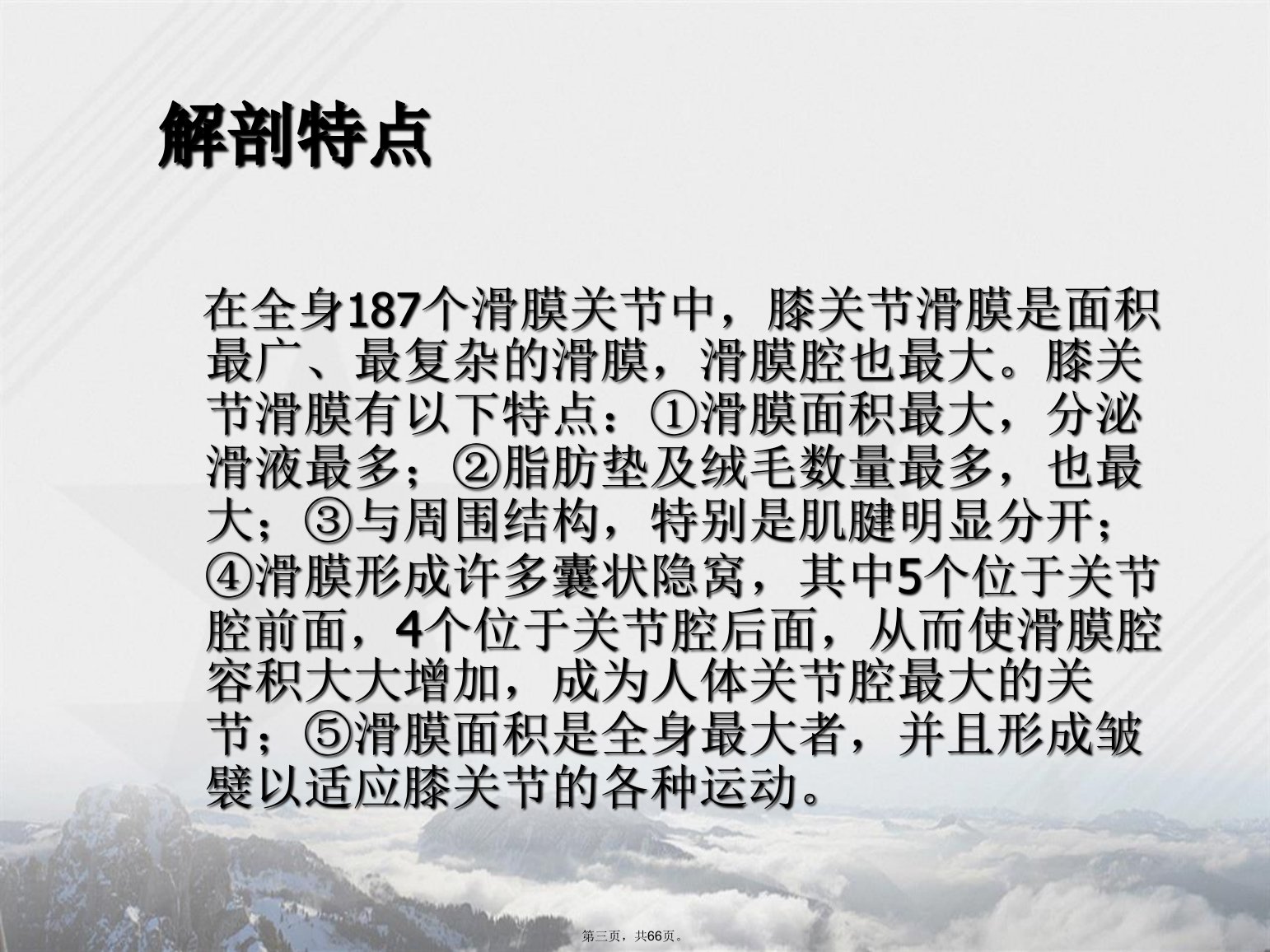膝关节滑膜炎的诊断与治疗徐俊第一页,共66页。概述--解剖膝关节侧面观第二页,共66页。解剖特点在全身187个滑膜关节中,膝关节滑膜是面积最广、最复杂的滑膜,滑膜腔也最大。膝关节滑膜有以下特点:①滑膜面积最大,分泌滑液最多;②脂肪垫及绒毛数量最多,也最大;③与周围结构,特别是肌腱明显分开;④滑膜形成许多囊状隐窝,其中5个位于关节腔前面,4个位于关节腔后面,从而使滑膜腔容积大大增加,成为人体关节腔最大的关节;⑤滑膜面积是全身最大者,并且形成皱襞以适应膝关节的各种运动。第三页,共66页。膝关节伸直时可容纳60ml液体,轻度屈曲可容纳88ml。正常情况下膝关节内仅有0.13~3.5ml的滑液。滑液以...