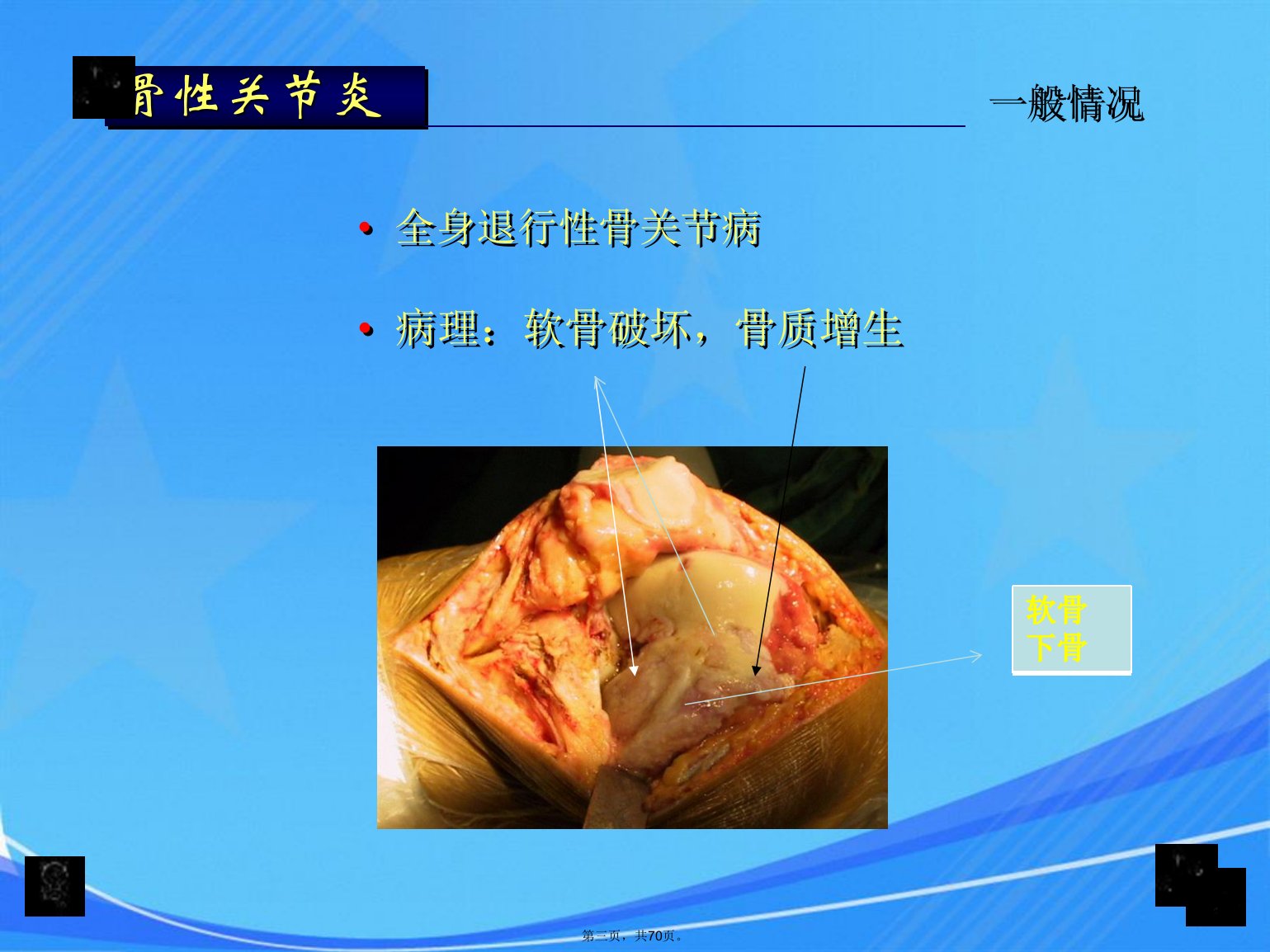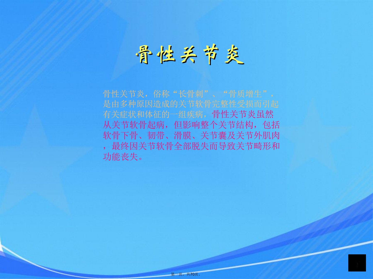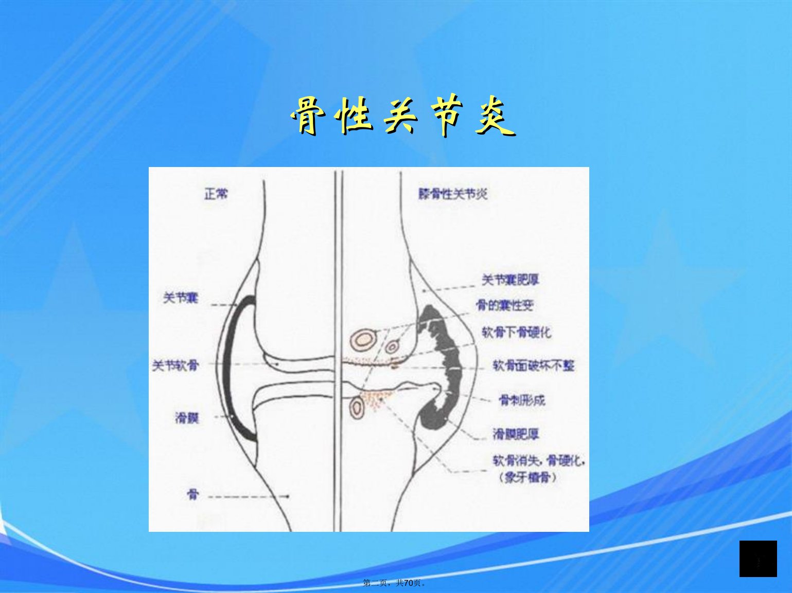 骨性关节炎俗称“长骨刺”、“骨质增生”由关节软骨受损引发影响整个关节结构最终导致关节畸形和功能丧失。病理表现为软骨破坏与骨质增生症状包括疼痛、晨僵、肿胀和畸形。诊断依据包括近一个月膝关节反复疼痛、X线显示关节间隙变窄等。骨性关节炎好发于膝、髋、肘、腕、指和椎间关节等分类包括继发性、创伤性、先天性等。原发性骨性关节炎病因尚不明确涉及年龄、生物力学、生物化学和遗传因素。治疗目的在于缓解疼痛、减轻炎症、延缓软骨退化、改善功能。治疗方法包括非药物治疗、药物治疗和手术治疗。药物治疗中改善症状的药物有NSAIDs等改善结构的药物有硫酸软骨素等。全球治疗趋势显示外用剂型使用普遍对于轻中度疼痛患者可单独或联合应用外用止疼药物。