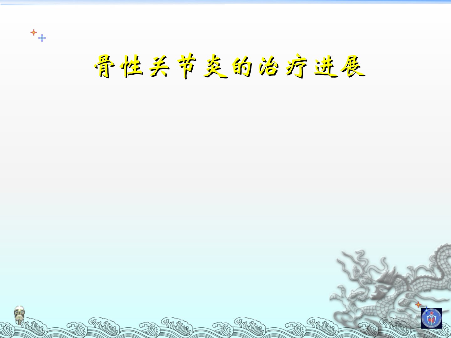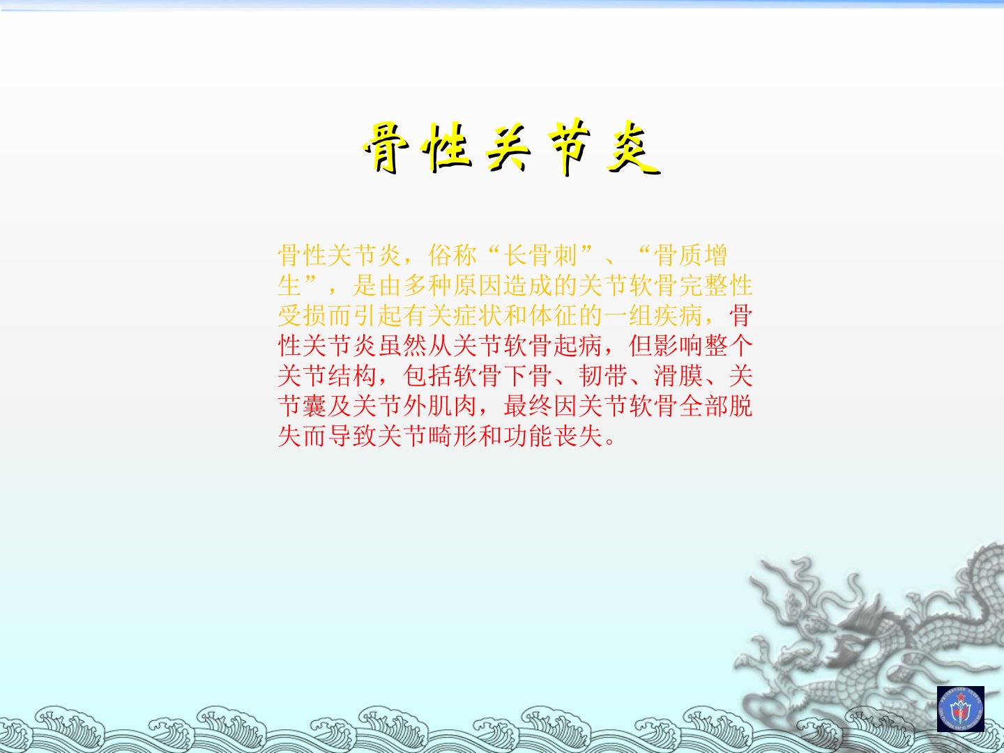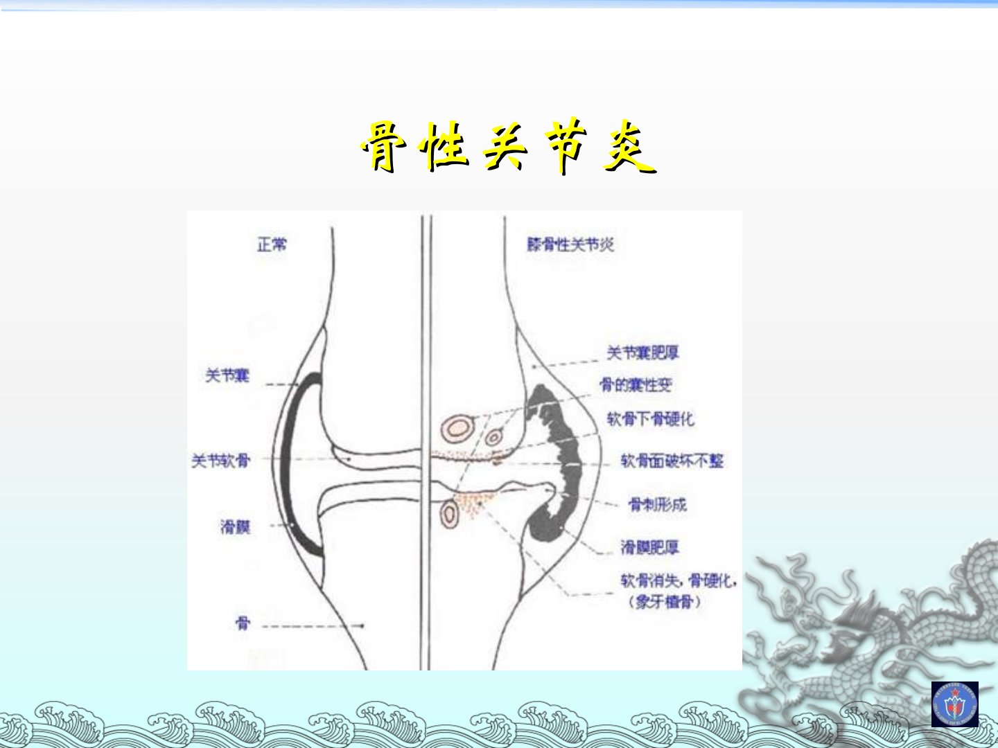 骨性关节炎由多种原因造成关节软骨受损而引发影响整个关节结构最终导致关节畸形和功能丧失。其症状包括疼痛、晨僵、肿胀和畸形等体征有压痛、骨骼膨大和功能受限。诊断依据包括反复膝关节疼痛、X线显示关节间隙变窄等。骨性关节炎分为继发性和原发性病因尚不十分明确可能与年龄、生物力学、生物化学、遗传等因素有关。治疗目的是缓解疼痛、减轻炎症、延缓软骨退化、改善功能、矫正畸形和减轻残疾。目前治疗方法包括非药物治疗(物理治疗、有氧锻炼等)、药物治疗(改善症状药物和改善结构药物)和手术治疗(关节镜、关节软骨修复术等)。药物治疗中改善症状的药物包括NSAIDs等改善结构的药物包括硫酸软骨素、硫酸氨基葡萄糖等。外科治疗主要针对保守治疗无效者。未来多模式镇痛和外用药联合用药或是骨性关节炎药物治疗发展方向。