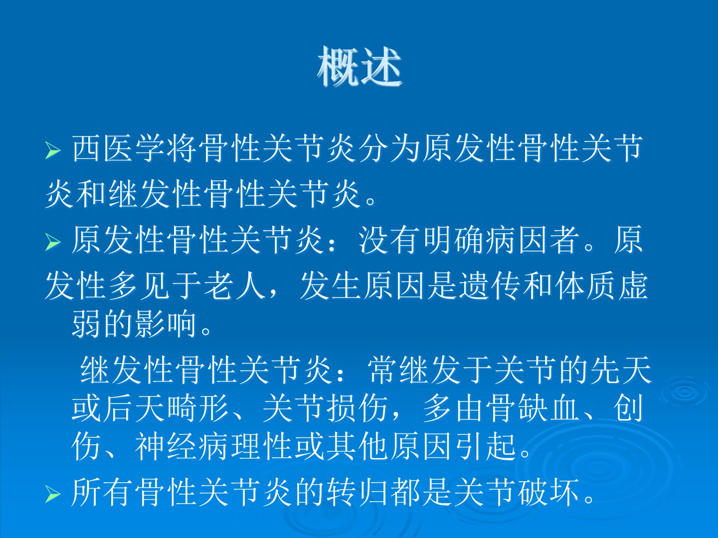 膝关节骨性关节炎(KOA)是常见的慢性关节疾病以膝关节软骨损害为特征多见于50岁以上女性。西医学将其分为原发性和继发性两类前者无明确病因多与遗传和体质虚弱有关后者常继发于关节畸形或损伤。中医学认为其属痹症主要由气血虚弱、辛苦失度和肝肾不足所致。针刀医学认为该病根本原因是膝关节内部力平衡失调。膝关节是人体最复杂、负重最多的关节由股骨、胫骨、髌骨等构成周围有肌肉和韧带保护。病因包括年龄、性别、肥胖等病理特点为关节软骨破坏、骨质增生等。临床表现为疼痛、肿胀、僵硬、活动受限等诊断要点包括症状、X线拍片和实验室检查。治疗包括非药物治疗、药物治疗、外科治疗和针刀治疗术后需注意休息和康复锻炼。
