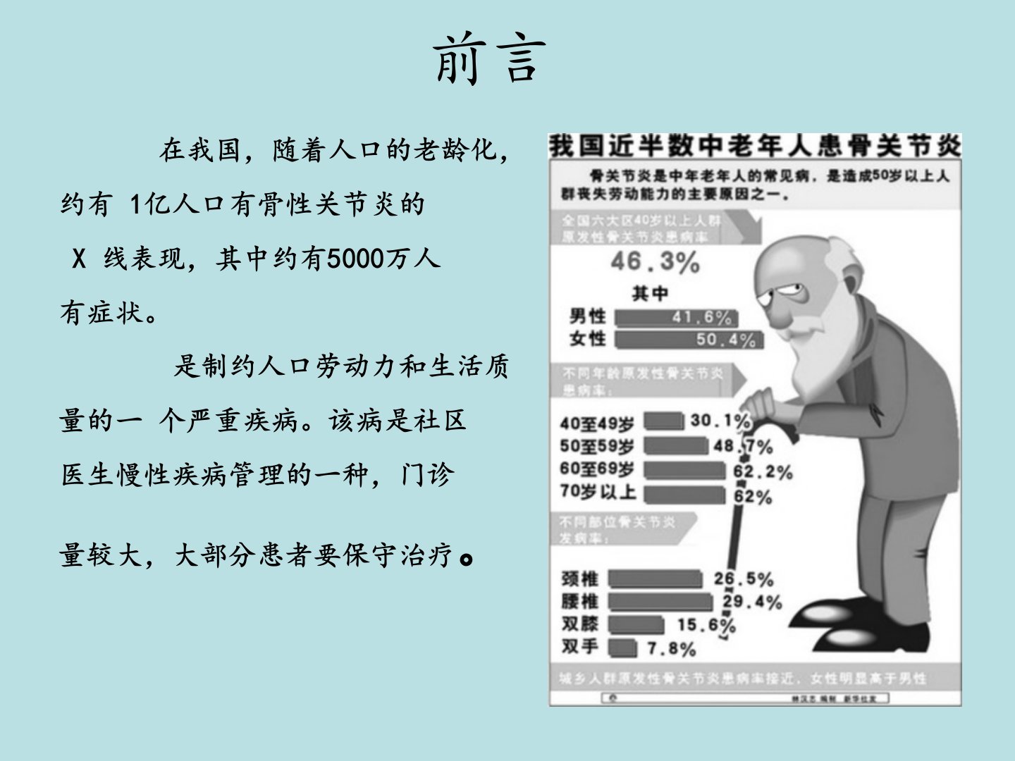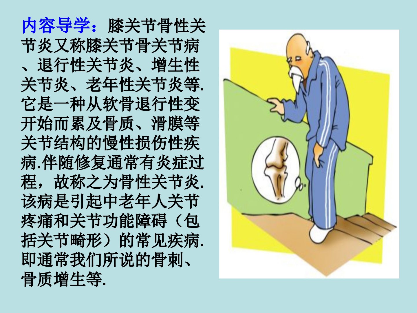 膝关节骨性关节炎摘要膝关节骨性关节炎又称退行性增生性老年性关节炎是一种慢性损伤性疾病源于软骨退行性变累及骨质、滑膜等是中老年人关节疼痛和功能障碍的常见疾病。我国老龄化背景下约1亿人有骨性关节炎的X线表现其中5000万人有症状严重影响劳动力与生活。病因上个体因素(女性、肥胖)、饮食、免疫异常、气候、生物力学(如穿高跟鞋)、医源性因素(长期使用皮质醇类药物)等均可能致病。发病机制上分为原发性和继发性两大类。临床表现包括胶着现象、疼痛、关节强硬和畸形、肿胀、跛行和滑脱感、功能障碍等。影像学检查常用X线、CT、MRI关节镜可显示关节内部情况并做治疗。治疗目的在于减轻疼痛、矫正畸形、恢复功能。治疗方法包括非手术治疗(物理治疗、药物治疗、注射疗法、氨糖疗法、自我行为疗法)和手术治疗。同时文章指出了关于膝关节骨性关节炎的常见认识误区。