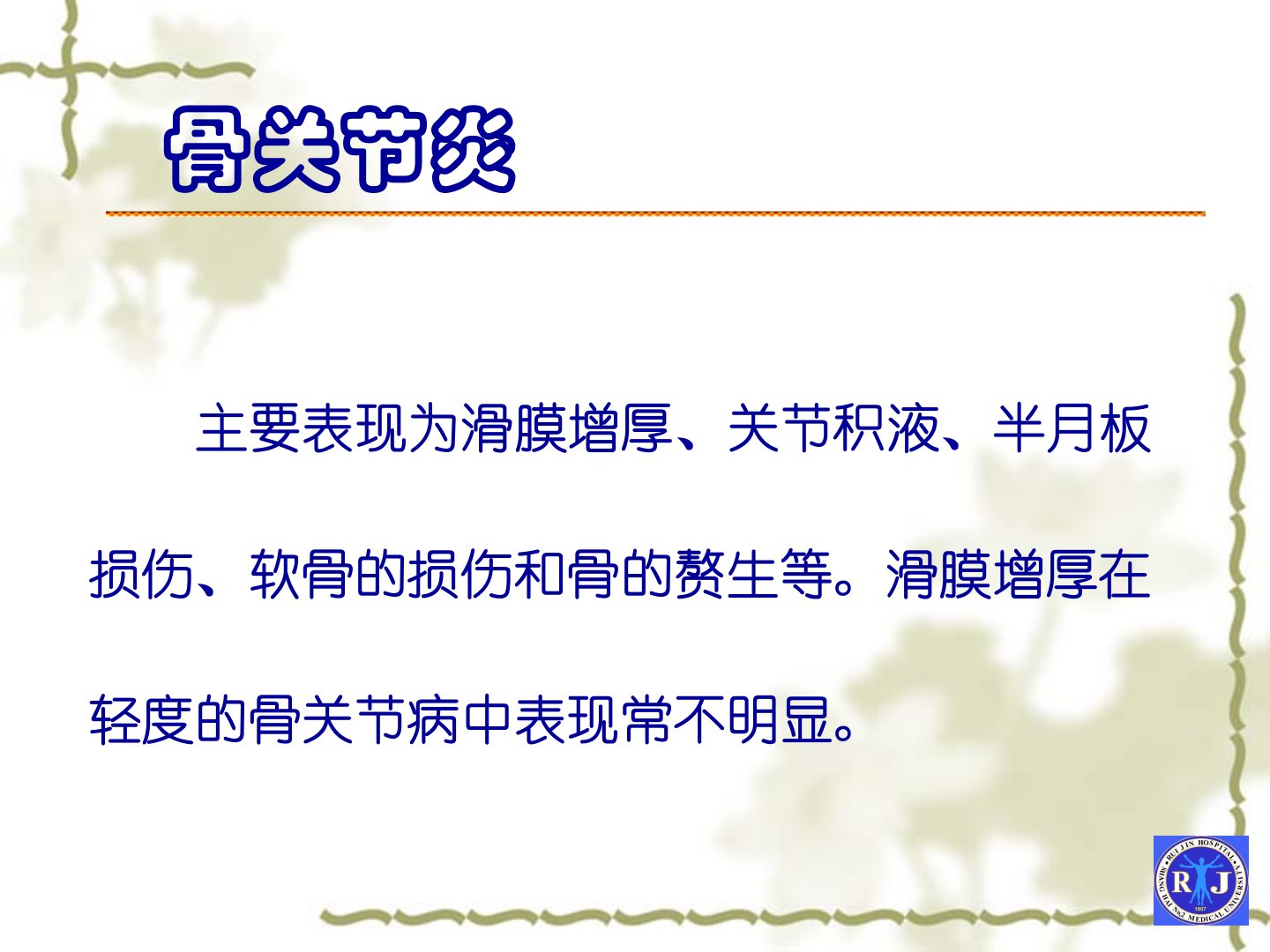 膝关节炎类型多样影像学特点各异。骨关节炎常见滑膜增厚、关节积液、半月板与软骨损伤及骨赘生轻度时滑膜增厚不明显外伤后可见陈旧性骨损伤伴软骨、韧带等损伤及少量积液。化脓性关节炎则表现为关节软组织肿胀、积液累及骨组织和骨髓。类风湿关节炎可见滑膜增生、血管翳形成、关节软骨病变、骨质异常、关节囊积液及半月板、韧带异常等。痛风作为尿酸代谢障碍病多累及手足小关节可见滑膜增厚、血管翳形成、软骨破坏等。血友病性关节炎也有特定影像学表现。神经性骨关节病由神经疾患引起多发生于活动多的关节表现为关节积液、半脱位等脊髓空洞症及神经性关节炎X线可见关节面不规则、缺损。