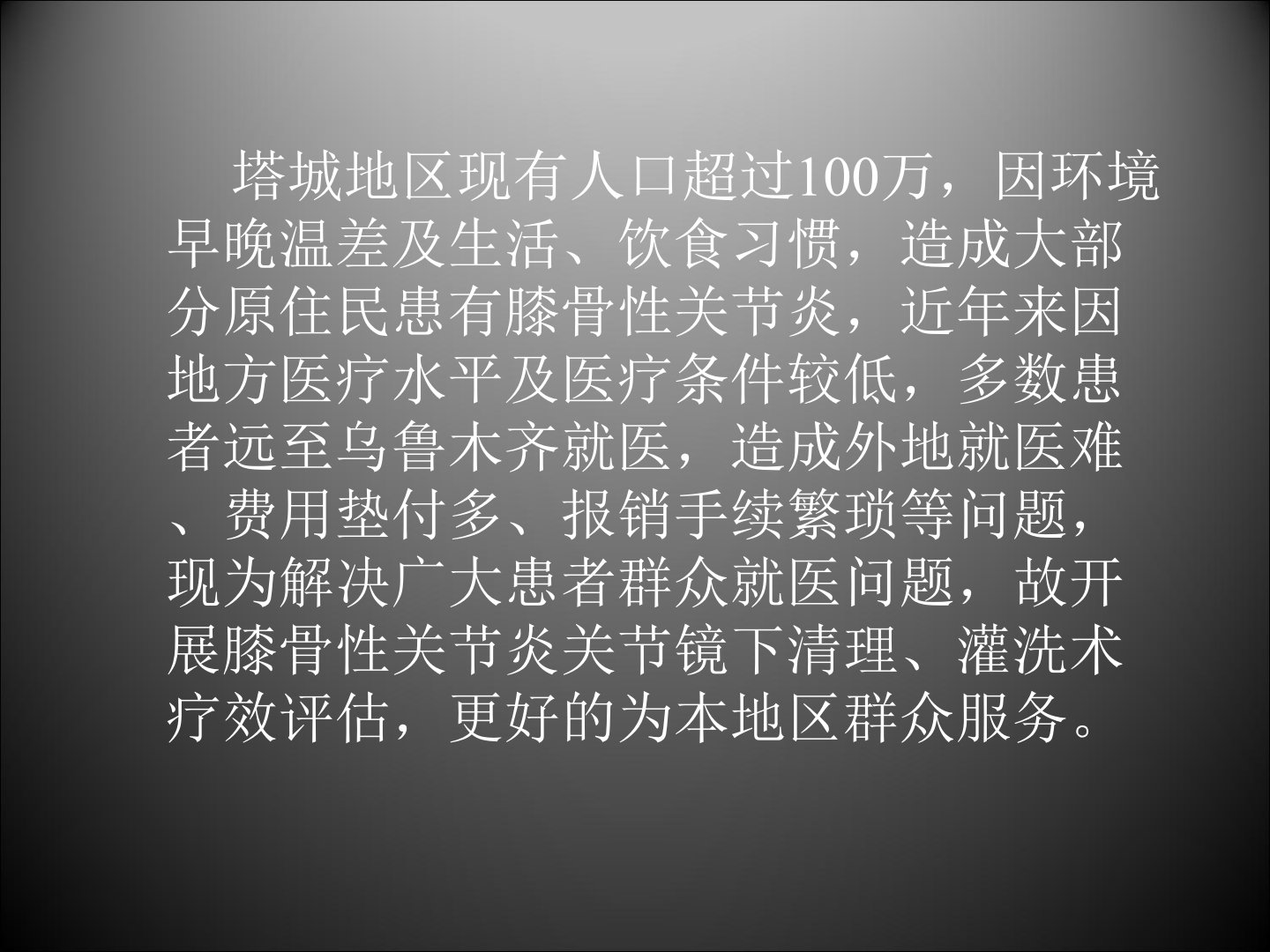 塔城地区人口超百万因环境、生活习惯多数原住民患膝骨性关节炎。受限于当地医疗水平多数患者前往乌鲁木齐就医面临诸多难题。为解决患者就医问题塔城地区人民医院骨科开展膝骨性关节炎关节镜下清理、灌洗术疗效评估。关节镜术可全面观察关节内部具有切口小、创伤小、康复快、并发症少等优点适应症包括关节炎治疗、游离体摘除、半月板手术等。关节镜术可将膝关节疾病诊断准确率提高至97但需结合临床和其它辅助检查且不能完全取代开放手术。塔城地区医院现有夏建江等主任医师及辽宁专家团队人员配备充足、技术成熟且具备关节镜检查基础设备但设备存在陈旧老化、部分缺失问题。预期通过关节镜术微创诊断治疗膝骨性关节病减少手术创伤、降低费用避免患者外地就医难题解决当地膝骨性关节炎治疗问题。
