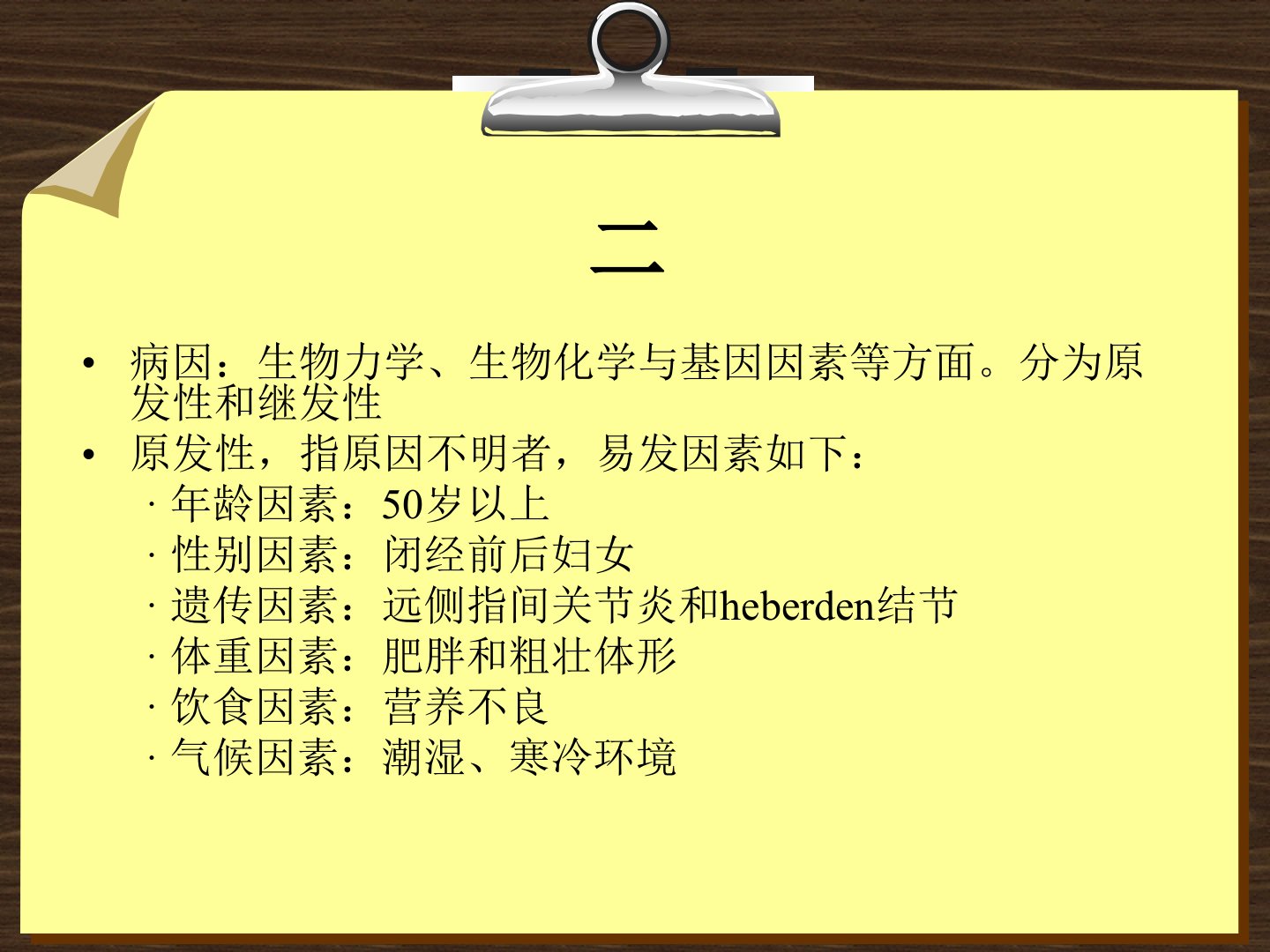 骨性关节炎病因包括生物力学、生物化学与基因因素分原发性和继发性两类。原发性原因不明易发因素有:50岁以上、闭经前后妇女、遗传、肥胖粗壮体形、营养不良、潮湿寒冷环境等。继发性则继发于外伤、先天性膝内外翻、代谢性疾病(假性痛风、大骨节病)、关节炎后遗症(RA、TB、血友病)、骨坏死等。生物力学方面下肢力线中的Q角男性小于10度女性小于15度Q角越大髌骨外移分力越大。非药物治疗包括科普教育、增强肌力锻炼、参加疾病俱乐部、使用辅助器械、社会组织的医学咨询、弹拨髌骨、电话热线、使用矫形支具、降低体重、职业治疗、有氧操、保护关节、节省能量、理疗、活动关节锻炼等。运动治疗对骨性关节炎有三级预防作用可提升关节功能改善生活品质还应重视本体感觉训练。