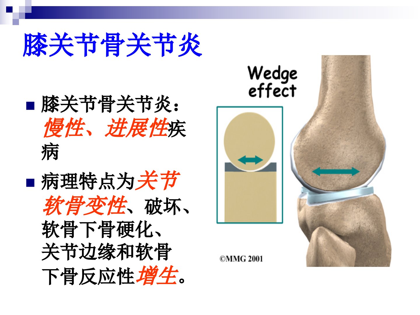 膝骨关节炎是慢性进展性疾病病理特点为关节软骨变性、破坏等。目前膝骨关节炎是最常见和最重要的关节疾病60岁以上的人80以上在膝关节可见骨性关节炎X线征象其中20有疼痛和活动受限。膝关节磨损严重站立或走平路时膝盖内软骨平均承受121倍多体重的压力危险因素包括年龄、肥胖、性别等。临床表现主要为疼痛、肿胀、畸形和功能障碍疼痛与气温、气压等因素有关肿胀由软组织变性增生等导致畸形以膝内翻多见功能障碍多为活动受限。X线检查可见关节间隙狭窄等特征。治疗包括非手术疗法如病人教育和咨询、适当休息、功能锻炼等。保护关节需注意保暖、使用辅助工具、功能训练、有氧锻炼、减肥等。运动疗法分三阶段包括关节增氧训练、瑜伽强膝训练、运动康复疗法可改善膝痛增强膝关节强度。