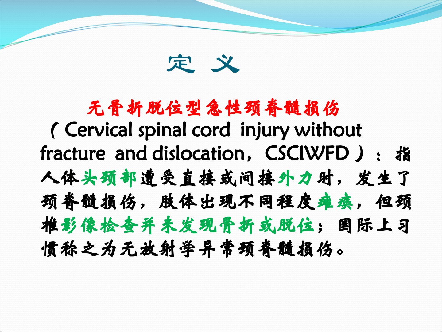 无骨折脱位型急性颈脊髓损伤护理------护理查房骨科护理组2016.04主要内容概述病例介绍护理问题护理措施无骨折脱位型急性颈脊髓损伤(Cervicalspinalcordinjurywithoutfractureanddislocation,CSCIWFD):指人体头颈部遭受直接或间接外力时,发生了颈脊髓损伤,肢体出现不同程度瘫痪,但颈椎影像检查并未发现骨折或脱位;国际上习惯称之为无放射学异常颈脊髓损伤。定义无骨折脱位型急性颈脊髓损伤发病机制当各种病理因素使椎管储备间隙显著减少、消失或脊髓受压变形时,意外而轻微创力,使颈椎椎间关节发生位移,或使颈椎发生意外活动,引起脊髓损伤。无骨折脱位型急...
