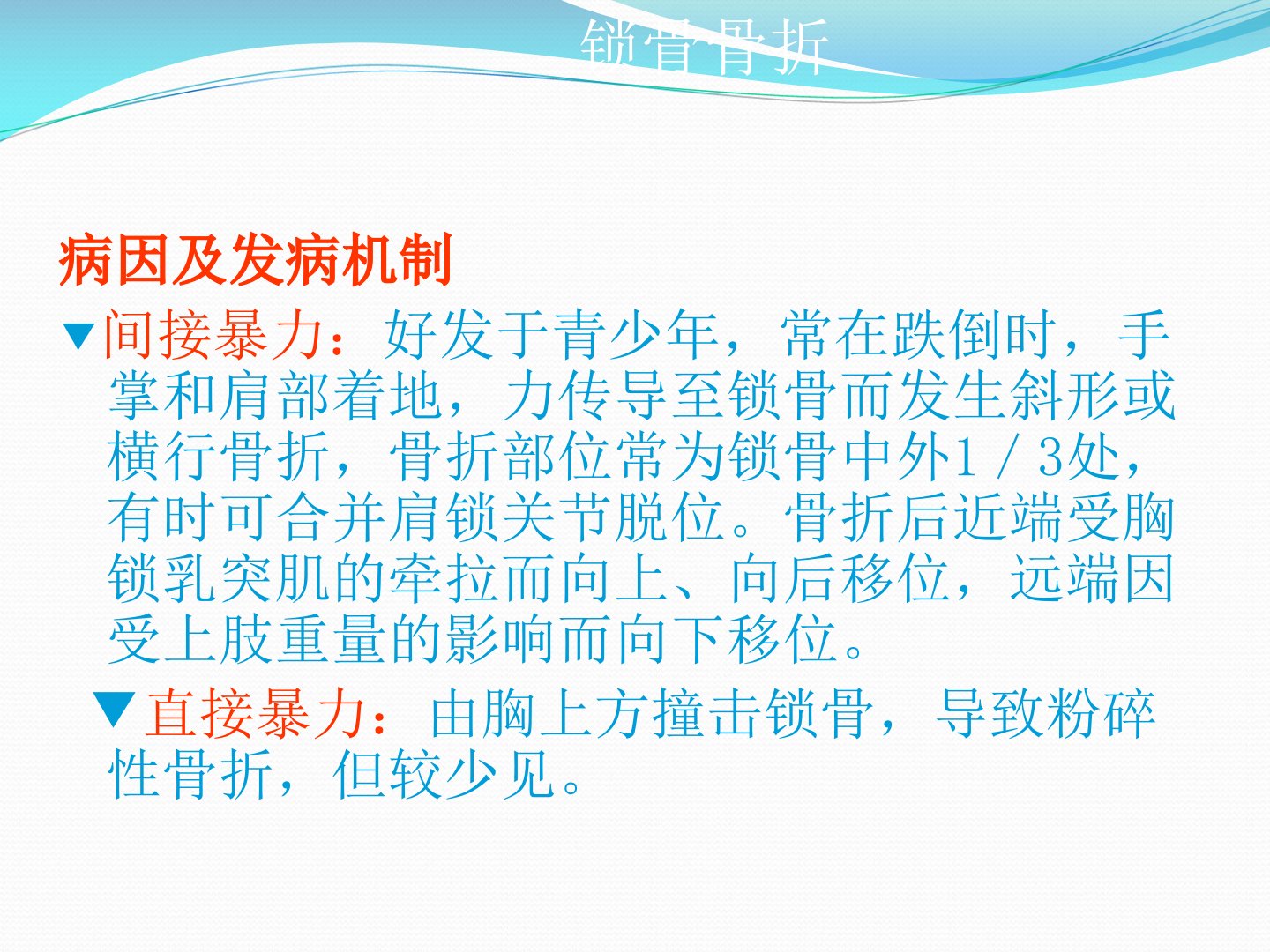 外科学骨折部分主要介绍了四肢骨折中的锁骨骨折、肱骨髁上骨折、尺桡骨干双骨折、桡骨远端骨折、股骨颈骨折、股骨干骨折及胫腓骨干骨折的病因、病理、临床表现、辅助检查、处理原则及护理要点。锁骨骨折多由间接暴力导致好发于青少年表现为局部疼痛、肿胀、畸形等处理包括三角巾悬吊、手法复位等。肱骨髁上骨折分为伸直型和屈曲型多由间接暴力引起易损伤神经血管治疗包括手法复位、骨牵引等。尺桡骨干双骨折多见于暴力引起的开放性骨折复位要求高治疗包括手法复位外固定和切开复位内固定。桡骨远端骨折多见于中老年骨质疏松者处理原则为手法复位和固定。股骨颈骨折老年人最常见处理原则包括持续皮牵引、手法复位内固定和人工股骨头置换。股骨干骨折多见于青壮年处理包括牵引治疗和手术切开复位内固定。胫腓骨干骨折多见于青壮年和儿童易发生骨筋膜室综合症治疗目的是恢复小腿长度、对线和持重功能。护理方面包括心理护理、一般护理、疼痛护理、病情观察、预防感染、牵引和小夹板固定护理、石膏绷带固定护理、并发症护理、功能锻炼指导和健康教育。