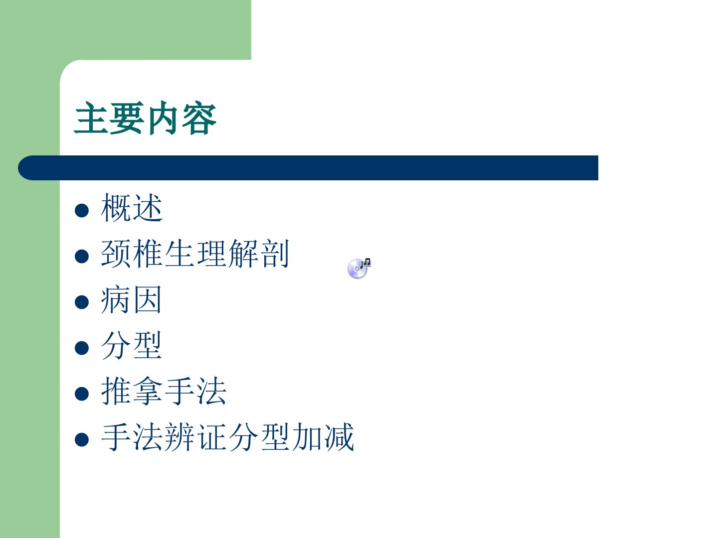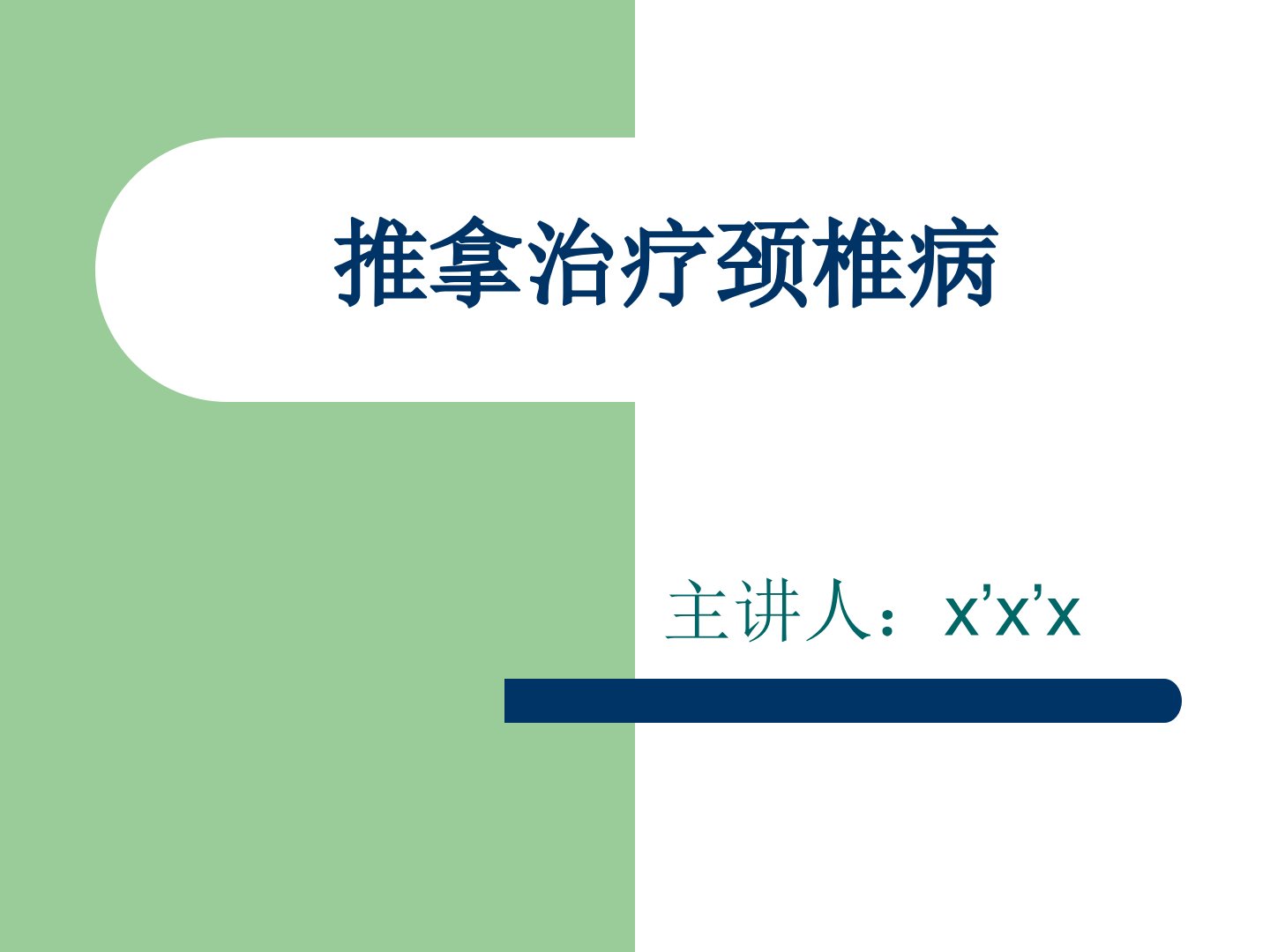主讲人xxx以推拿治疗颈椎病为主题展开讲解。颈椎病是颈椎骨关节炎等的总称以退行性病理改变为基础。颈椎解剖结构复杂病因包括外伤、颈部慢性劳损、颈椎退行型改变、先天畸形、颈椎感染等。分型有颈型、神经根性、椎动脉型、脊椎型、交感型、混合型颈椎病。不同分型表现不同如颈型有头、肩、颈等疼痛及相应压痛点;神经根型表现为肩部、上肢疼痛麻木等。推拿手法中常规手法有一指禅推法包括推、拿、按、摩等十二法一指禅推法要求沉肩、垂肘、悬腕等频率一般为120160次每分钟;拿法分为三指拿、四指拿等操作要连贯;还有滚肩颈滚法、弹拨按揉等。手法辨证加减方面颈型颈椎病重点按摩肌肉和穴位;神经根型颈椎病在常规手法基础上加天宗穴点按等步骤。