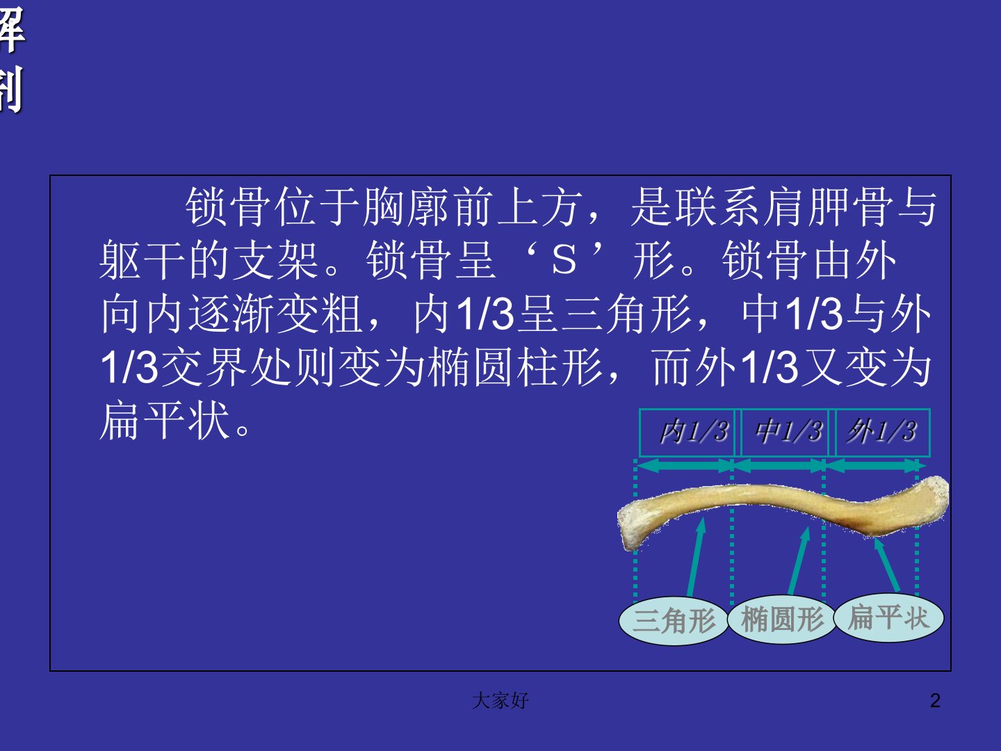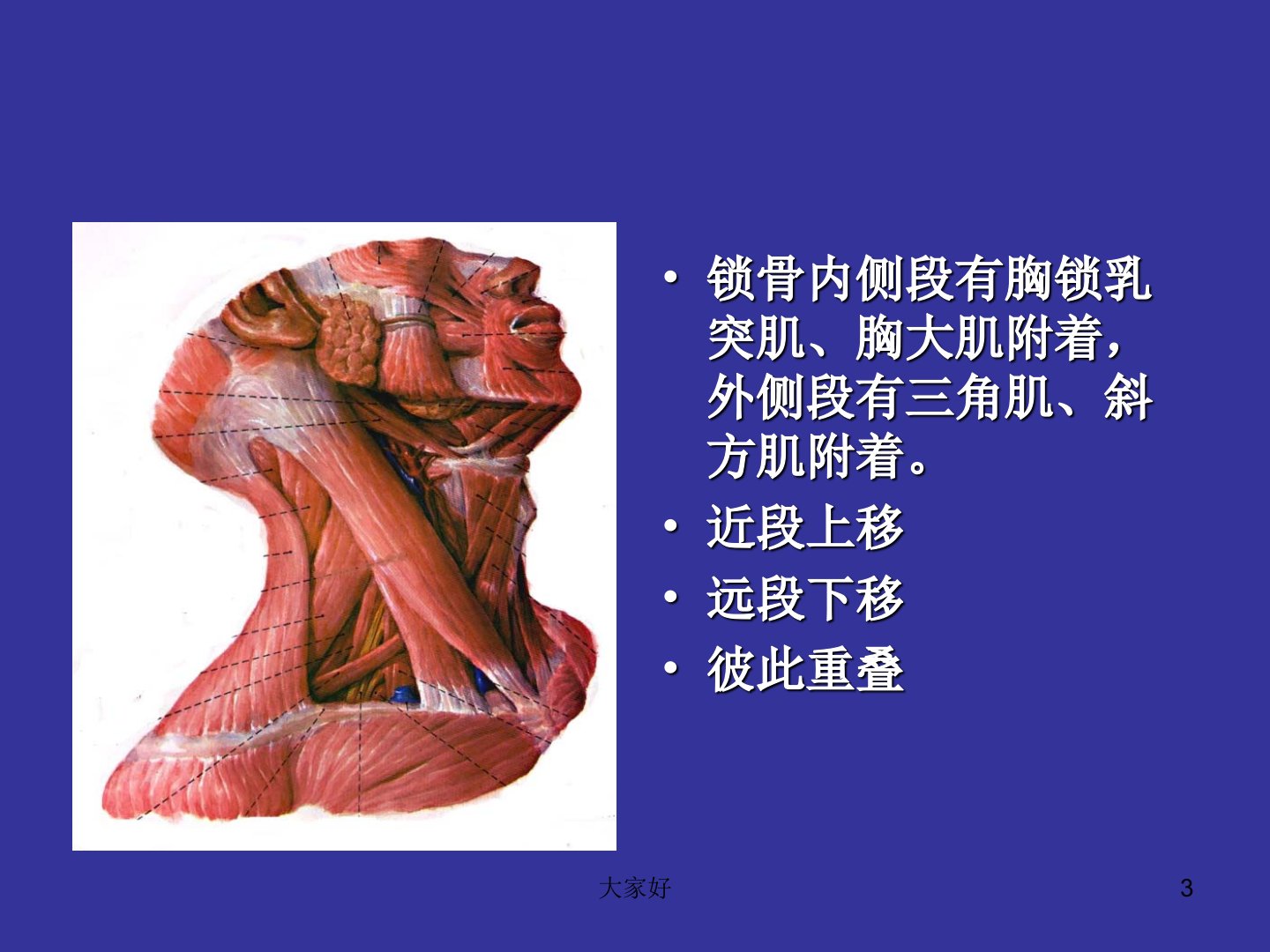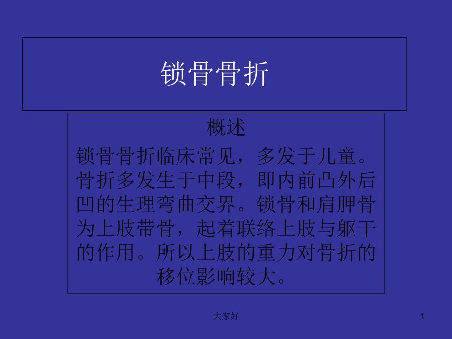 锁骨骨折临床常见多发于儿童多发生于锁骨中段。锁骨位于胸廓前上方呈“S”形是联系肩胛骨与躯干的支架内侧段有胸锁乳突肌等附着外侧段有三角肌等附着下方有臂丛神经和锁骨下动、静脉。病因上间接或直接暴力均可引发间接暴力多致中外13处斜形或横断形骨折幼儿多为青枝骨折。诊断依据包括肩部外伤史、伤后症状(患肩内收下垂等)、局部肿胀压痛、异常活动及骨擦音以及X线摄片检查结果。骨折分型包括青枝型、横断型和粉碎性。并发症有锁骨下动脉损伤、臂丛神经损伤等。治疗上大多经非手术治疗可治愈无移位或小儿青枝骨折可用三角巾悬吊有移位骨折应行手法复位、外固定如横“8”字绷带固定法等。内固定术适用于特定情况如伴喙锁韧带断裂等。术后需功能训练护理上要注意病人姿势和密切观察患侧上肢血运情况出院后要遵医嘱服药、加强营养等。