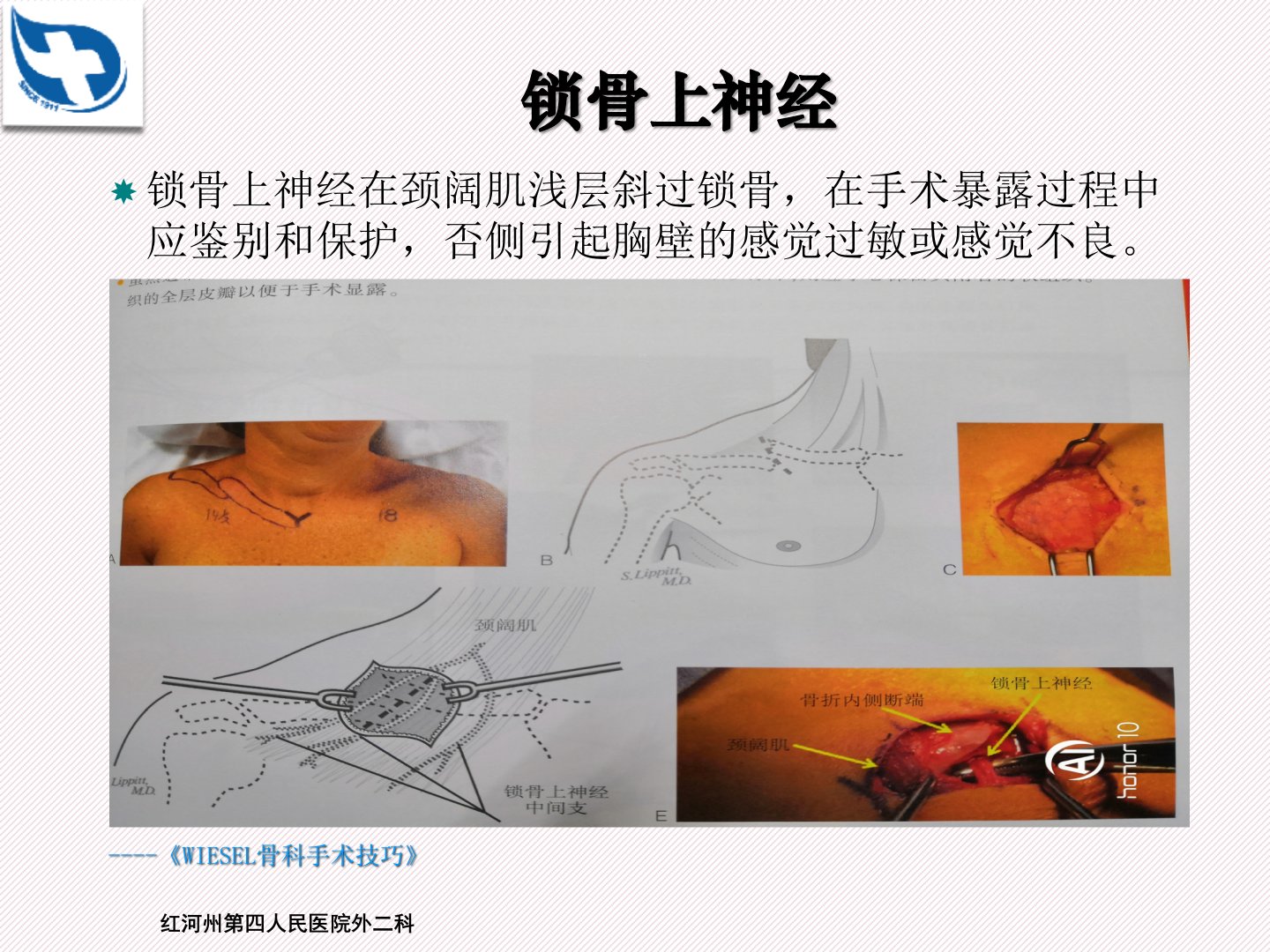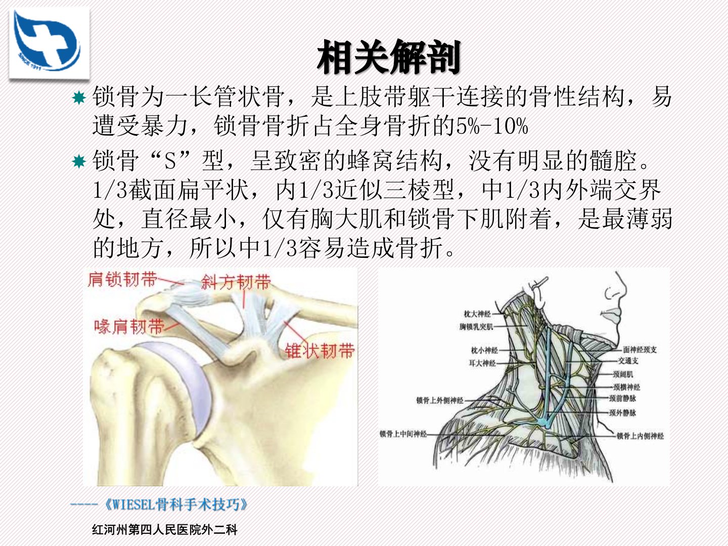 锁骨骨折的分型及治疗摘要锁骨为长管状骨呈“S”型是上肢与躯干连接的骨性结构易因暴力导致骨折占全身骨折的510。其解剖上中13处直径最小是最薄弱的地方容易造成骨折。锁骨上神经在手术暴露过程中应鉴别和保护否则会引起胸壁的感觉过敏或不良。手术时横切口易损伤神经分支致前胸壁麻木垂直切口则麻木发生率显著减低。锁骨骨折绝大多数是肩部受到直接暴力。其总体不愈合率是45风险随年龄、女性、移位和粉碎程度增加而升高。分型方面Allman将其分为三组Craig在此基础上细化Neer则对锁骨远端骨折进行分型。治疗上非手术治疗适用于对位可接受、短缩不超过15mm的骨折;手术治疗适用于开放性骨折、合并血管神经损伤、粉碎性骨折等。内固定物选择多样各有优缺点:钢板固定牢固但切口大、感染率高;髓内针操作简便但固定不牢固;记忆合金环抱器操作繁琐且手术过程中骨膜剥离较多会引起骨折延迟愈合或不愈合;“8”字钢丝操作简便但对粉碎性骨折固定效果不佳。对于锁骨远端骨折合并肩锁关节脱位钩钢板螺钉是经典方法但并发症多锁骨双钩钢板可有效固定并保证微动。最终手术方式的选择应根据患者身体状况、骨折部位及粉碎程度而定原则为操作简便、固定可靠且