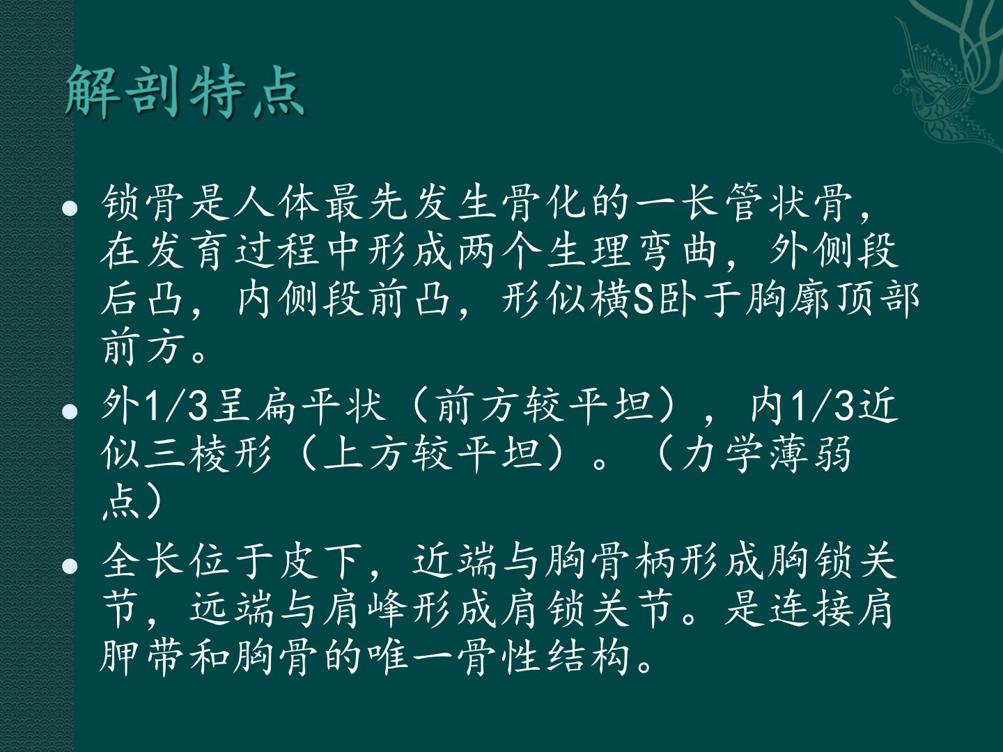 锁骨骨折及肩锁关节脱位诊疗摘要锁骨骨折1解剖特点:锁骨是人体最先骨化的长管状骨呈横S形卧于胸廓顶部前方力学薄弱点全长位于皮下连接肩胛带和胸骨。2病因及类型:好发于青少年及儿童多为间接暴力致斜形或横形骨折直接暴力致粉碎性骨折少见。非创伤因素如炎症、肿瘤等可致病理性骨折。分型有Neer分型和Craig分型。3临床表现:骨折后肿胀、瘀斑肩关节活动疼痛加重可扪及局限性压痛、骨擦感。需仔细检查上肢神经功能及血供注意合并症。4诊断:依据外伤病史、体征和X线片诊断必要时行CT检查。5治疗:非手术治疗适用于儿童青枝骨折等采用外固定但有缺陷及并发症。手术治疗指征多样方式有克氏针、钢板螺钉内固定等要注意保护神经血管也有手术并发症。6延迟愈合或不愈合原因:致伤因素、骨折部位、类型、治疗方法及操作不当、感染、取出内固定物过早、活动不当等。7预防措施:保护血运提高手术技能选择合适内固定物。肩锁关节脱位肩峰受打击时关节囊及周围韧带断裂而脱位分六度。I度、II度可保守治疗III度及以上需手术常用切开复位锁骨钩钢板或张力带钢丝固定。