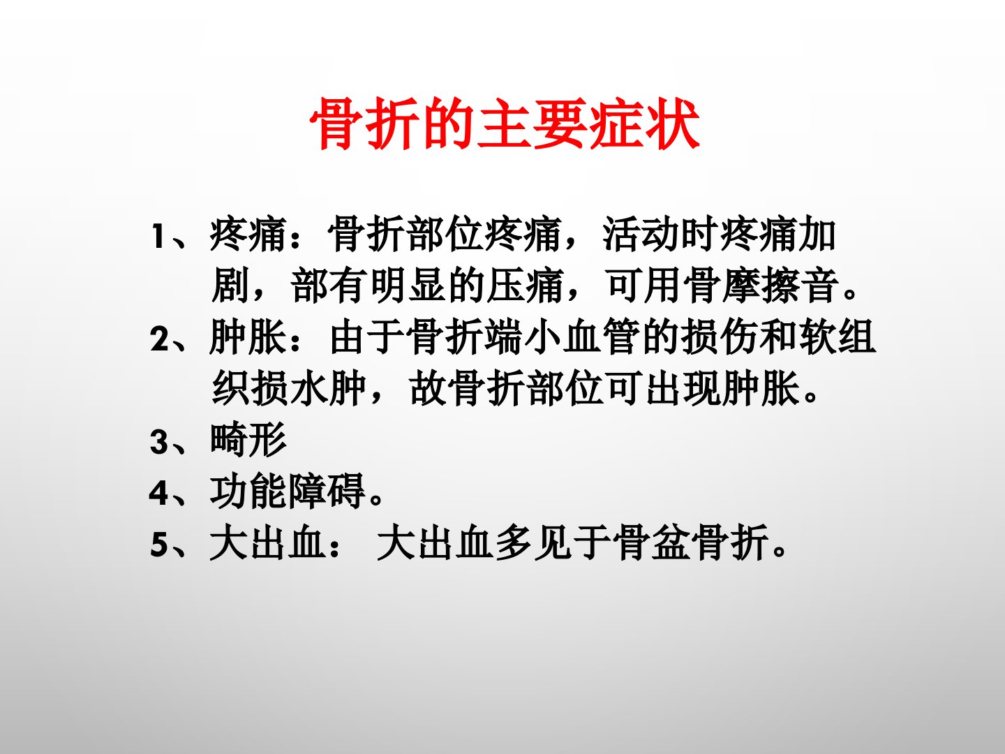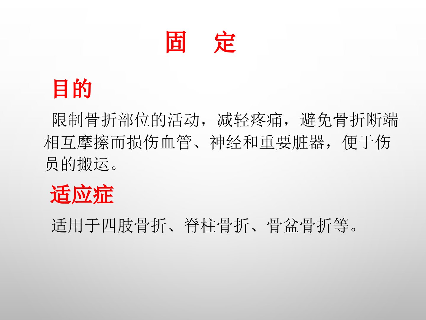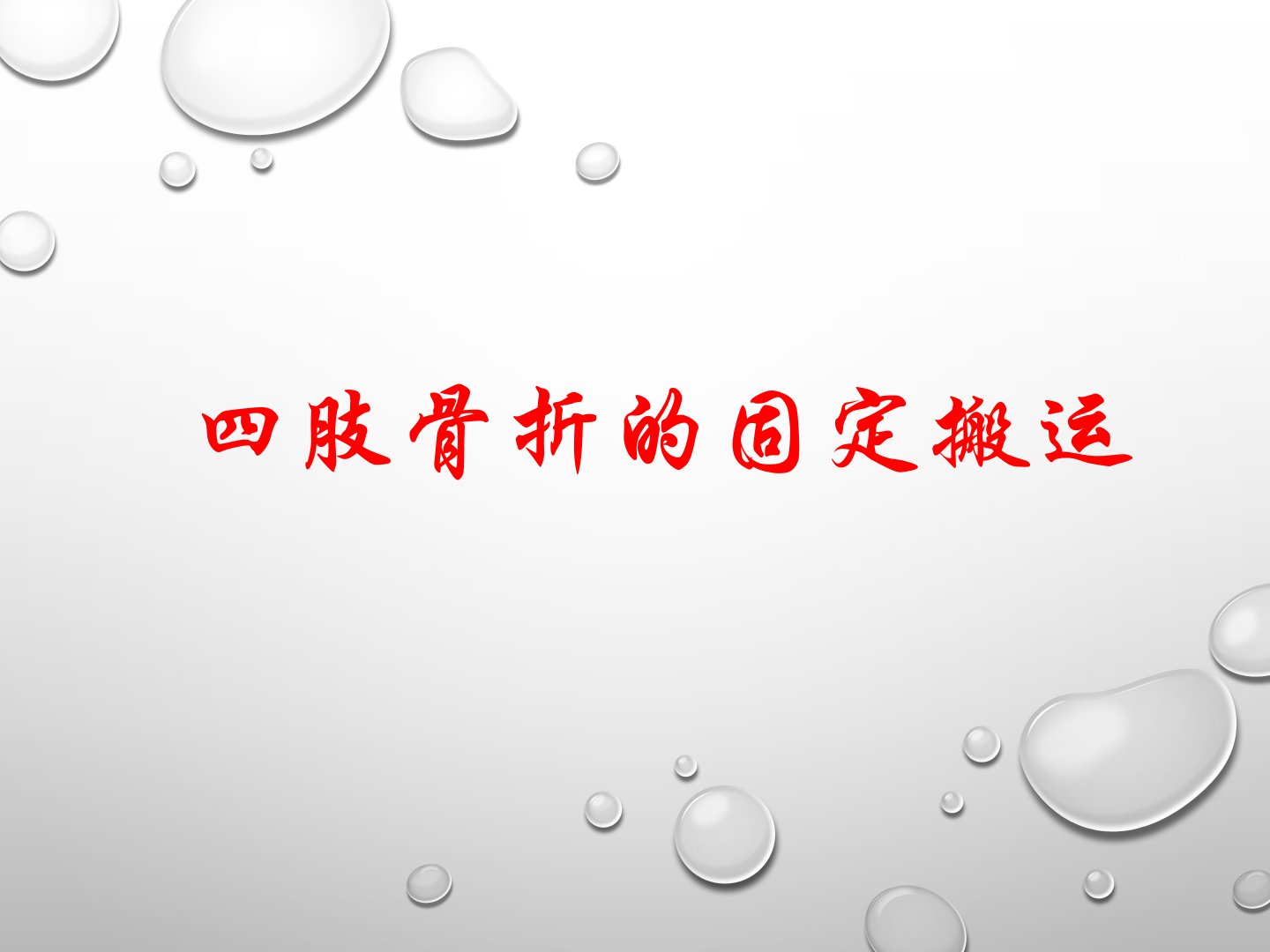 四肢骨折固定搬运旨在限制骨折部位活动减轻疼痛避免血管、神经等受损便于伤员搬运。其适应症包括四肢、脊柱、骨盆骨折等骨折主要症状有疼痛、肿胀、畸形、功能障碍和大出血。固定材料包括夹板(可用树枝、竹片等代替)和敷料(如棉花、布块等用于垫衬三角巾、绷带等用于包扎)。操作方法因骨折部位而异如肱骨骨折用长、短夹板固定后屈肘90度悬吊于胸前大腿、小腿骨折则需保护好伤口用带子固定等。注意事项包括开放性骨折不可牵引患肢、固定时先固定上端再固定下端等。搬运目的是及时、迅速、安全转运伤员常用搬运工具有床板、梯子、担架等。搬运前需评估现场环境、伤病者伤势等搬运时保持平衡、站稳脚步尽量动员人手。徒手搬运方法有单人法(扶行法、背负法等)和双人法(椅托式、轿式等)三人或四人搬运需保持脊柱轴线平稳颈椎损伤患者搬运需特别注意头部的固定与牵引担架搬运法是常用方法之一需注意伤病员体位、保暖和安全带使用。
