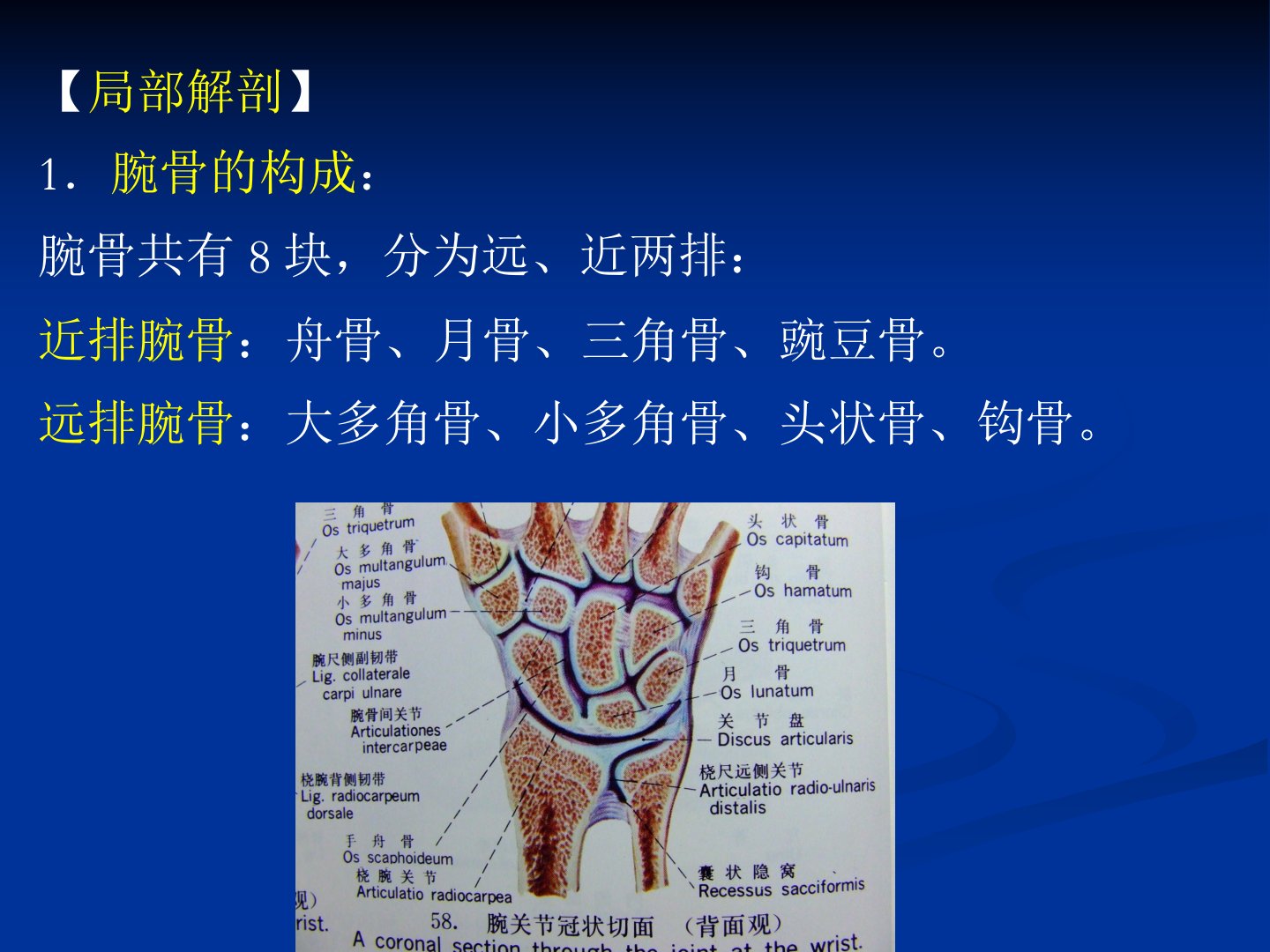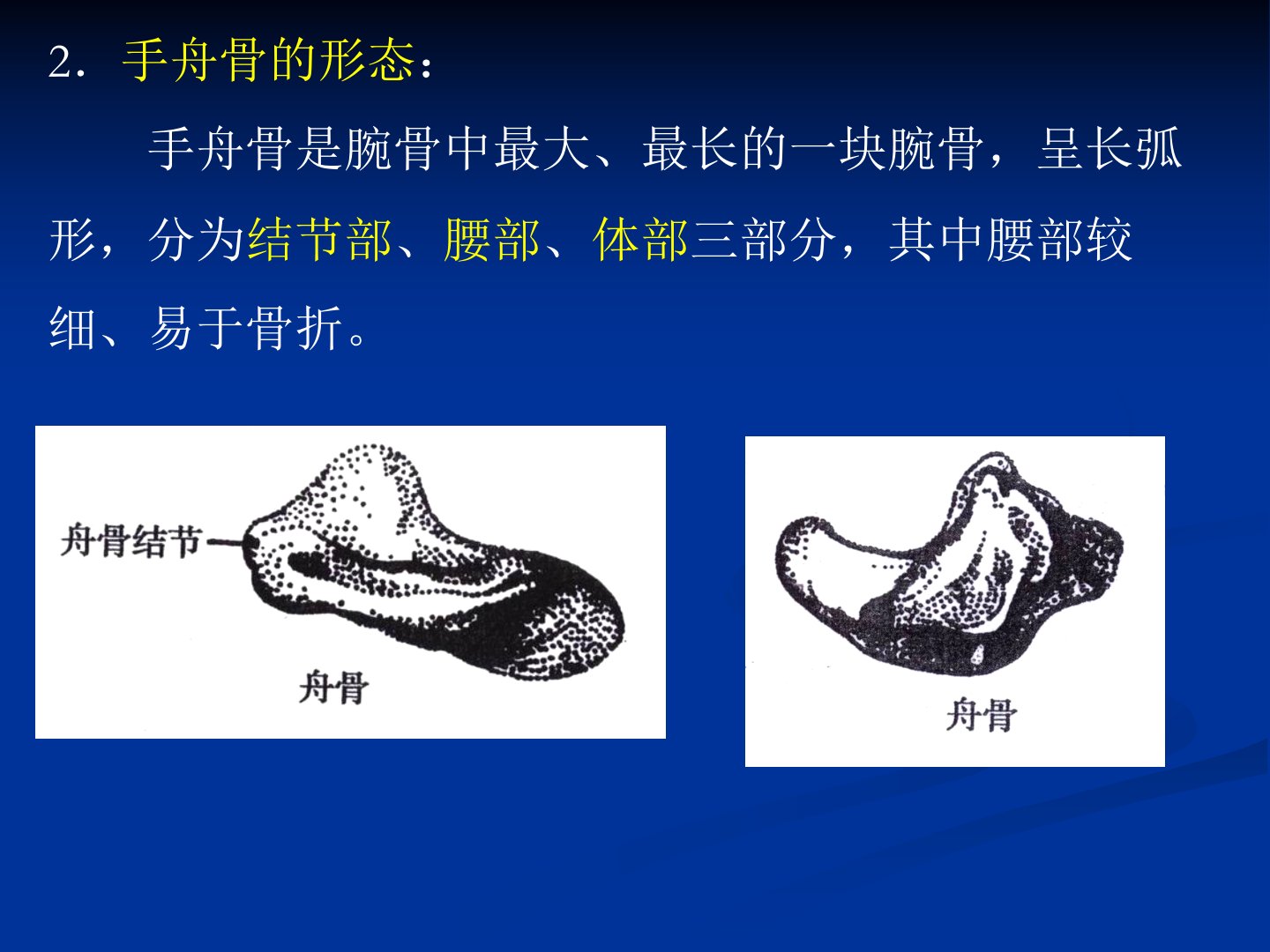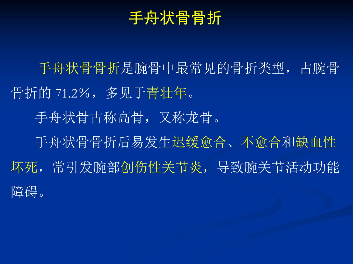 手舟状骨骨折是腕骨中最常见骨折类型占腕骨骨折的712多见于青壮年易发生迟缓愈合、不愈合、缺血性坏死导致腕关节活动功能障碍。手舟骨是腕骨中最大、最长的一块呈长弧形分为结节部、腰部、体部腰部较细、易于骨折。其表面大部分被关节软骨覆盖血液供应差腰部或体部骨折后近端骨折块常因缺血出现愈合问题。病因多为摔倒时手掌触地腕关节极度背伸、桡偏所致。骨折分型包括:按部位分为结节部、腰部、近端骨折;按稳定情况分为稳定型、不稳定型、移位型骨折;按骨折线方向分为桡斜形、尺斜形、横向型。并发症包括骨折迟缓愈合、不愈合、缺血性骨坏死及创伤性关节炎。诊断要点包括伤后腕部症状、“鼻烟窝”处压痛、X线检查等。治疗包括整复固定、手术及药物治疗固定后需进行手指屈伸等活动去固定后进行腕关节屈伸等活动。