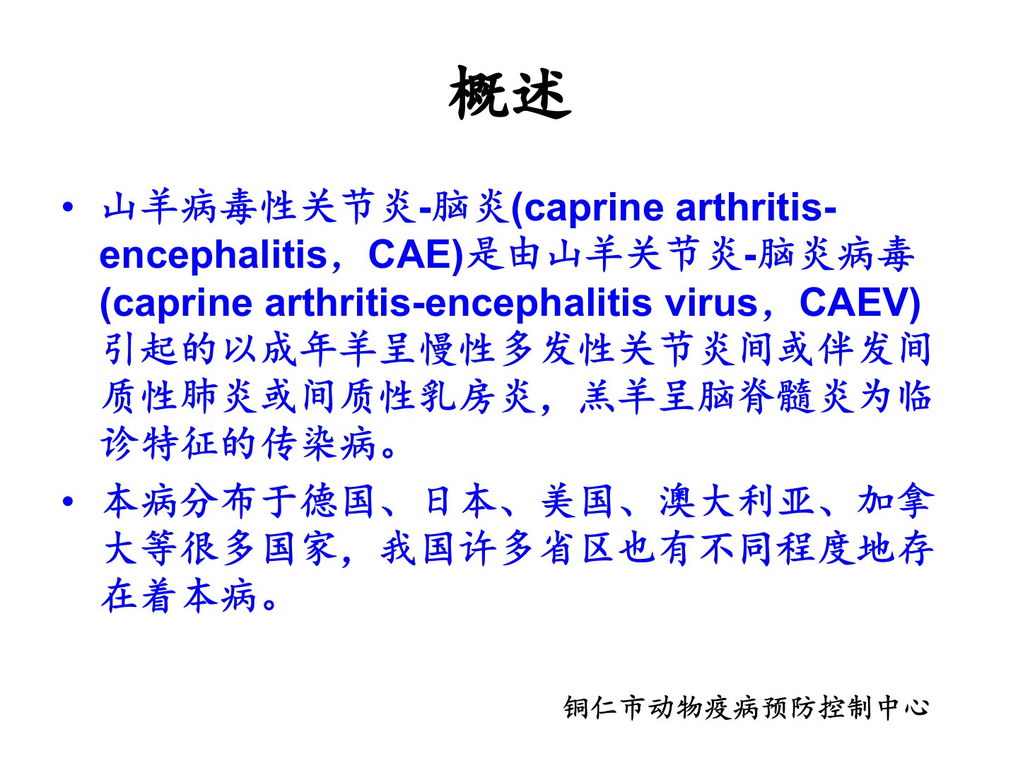 铜仁市动物疫控中心指出山羊病毒性关节炎脑炎(CAE)由CAEV引起成年羊多表现为慢性多发性关节炎伴发间质性肺炎或乳房炎羔羊则表现为脑脊髓炎。该病广泛分布于全球多国发达国家感染率较高发展中国家感染率较低。中国19811984年从美国进口的奶山羊中检测出CAE1988年首次确诊并分离出病毒。CAEV为有囊膜的RNA病毒基因组可整合到感染细胞DNA中。病毒易从关节液、乳汁中分离常用SM细胞进行分离鉴定。山羊是主要易感动物主要通过吸吮含病毒的初乳和常乳水平传播也可通过感染羊的排泄物等经消化道感染。CAEV感染可引起多种临诊症状不满6月龄羔羊主要表现为脑脊髓炎型成年山羊主要表现为关节炎型。病变主要集中在中枢神经系统、四肢关节和肺、乳房等部位。目前采取检疫、扑杀、隔离、消毒和培育健康羔羊群的方法对感染羊群实行净化。