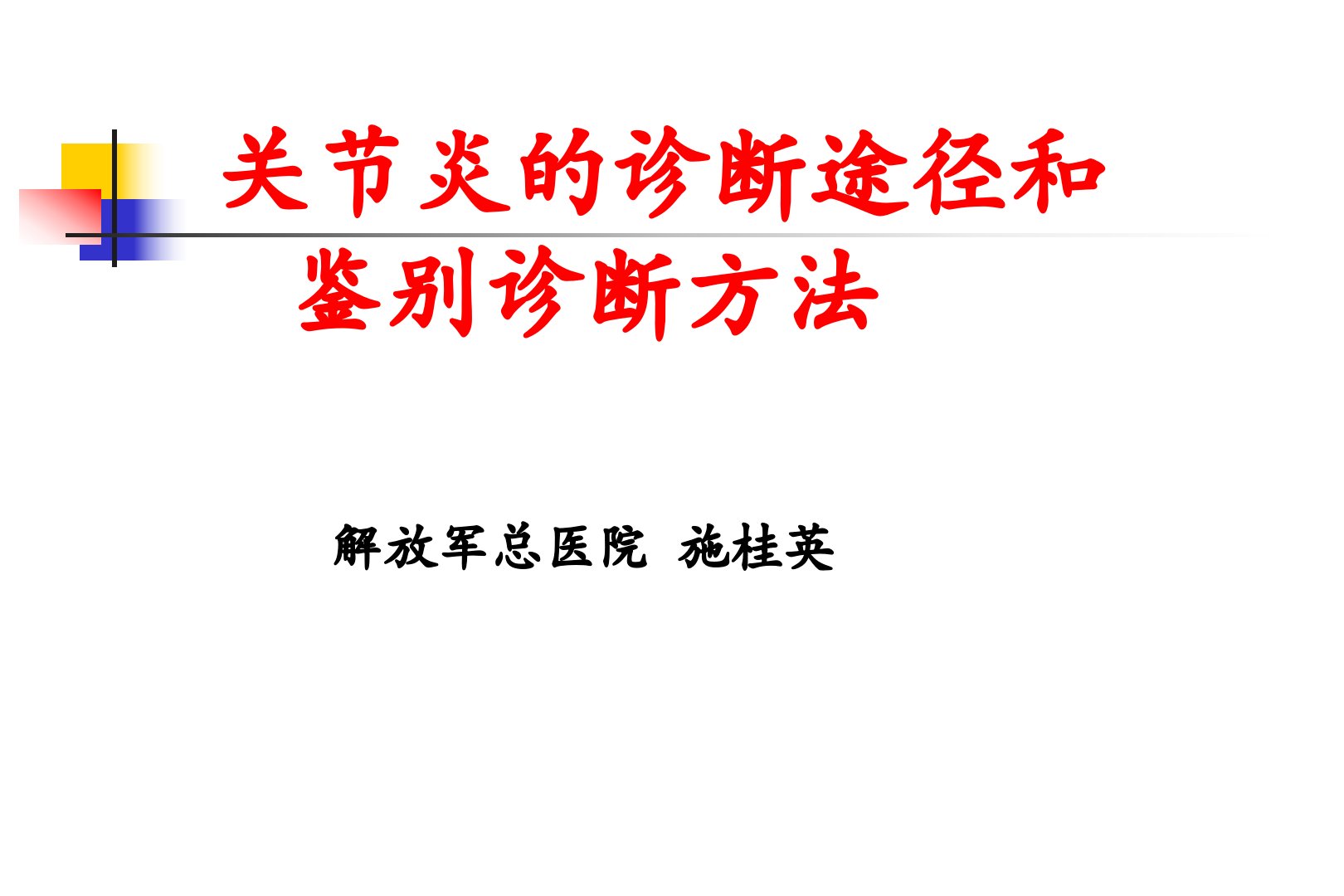 解放军总医院施桂英介绍了关节炎诊断途径与鉴别诊断方法。据统计美国人群中风湿病患病率较高关节炎症状在人群中占比3020需药物治疗510会致残。医学发展为关节炎诊断提供助力但完整病史采集与细致体检仍是最重要环节。关节炎症状包括疼痛、肿胀、发僵等体征有肿胀、触痛、发红等。采集病史时要关注发病前状况、演变过程、发病年龄、病变范围等。体检时需关注银屑疹、顶针样指甲等与关节炎相关的关节外体征。关节检查包括上肢、下肢及脊柱检查。常规化验、X光片、CT等辅助检查也必不可少。鉴别关节炎类型时需分单(少)关节炎、多关节炎急、慢性等不同情况讨论。诊断思路应从病史体检入手掌握病情用现代技术找确诊依据纵向掌握特点横向对比异同。