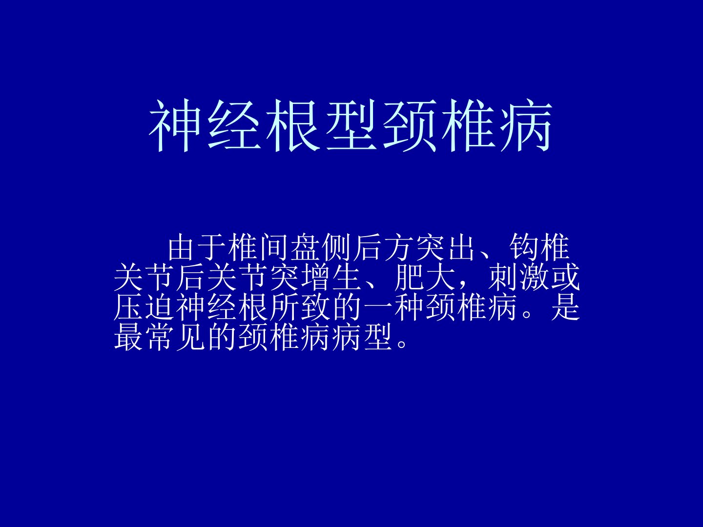 神经根型颈椎病是因椎间盘侧后方突出、关节增生肥大刺激或压迫神经根所致是最常见的颈椎病类型。其病因包括颈椎间盘退行性变(最基本病因)、损伤(急性损伤加重慢性损伤加速)及颈椎先天性椎管狭窄。临床表现包括根性神经痛、颈肩痛并向上肢放射、皮肤感觉异常、肢肌力下降、手指不灵活等。检查可见颈部肌肉痉挛、上肢肌肉萎缩、压痛及活动受限臂丛神经牵拉试验和压头试验阳性。影像学诊断依赖X线(显示颈椎生理前凸消失、椎间隙变窄等)、CT和MRI(显示椎间盘突出、椎管及神经根管狭窄受压)。治疗包括推拿按摩(手法轻柔次数不宜多)、理疗、自我保健疗法、药物治疗(醋酸泼尼松龙、利多卡因)及前路、前外侧、后路等手术治疗。