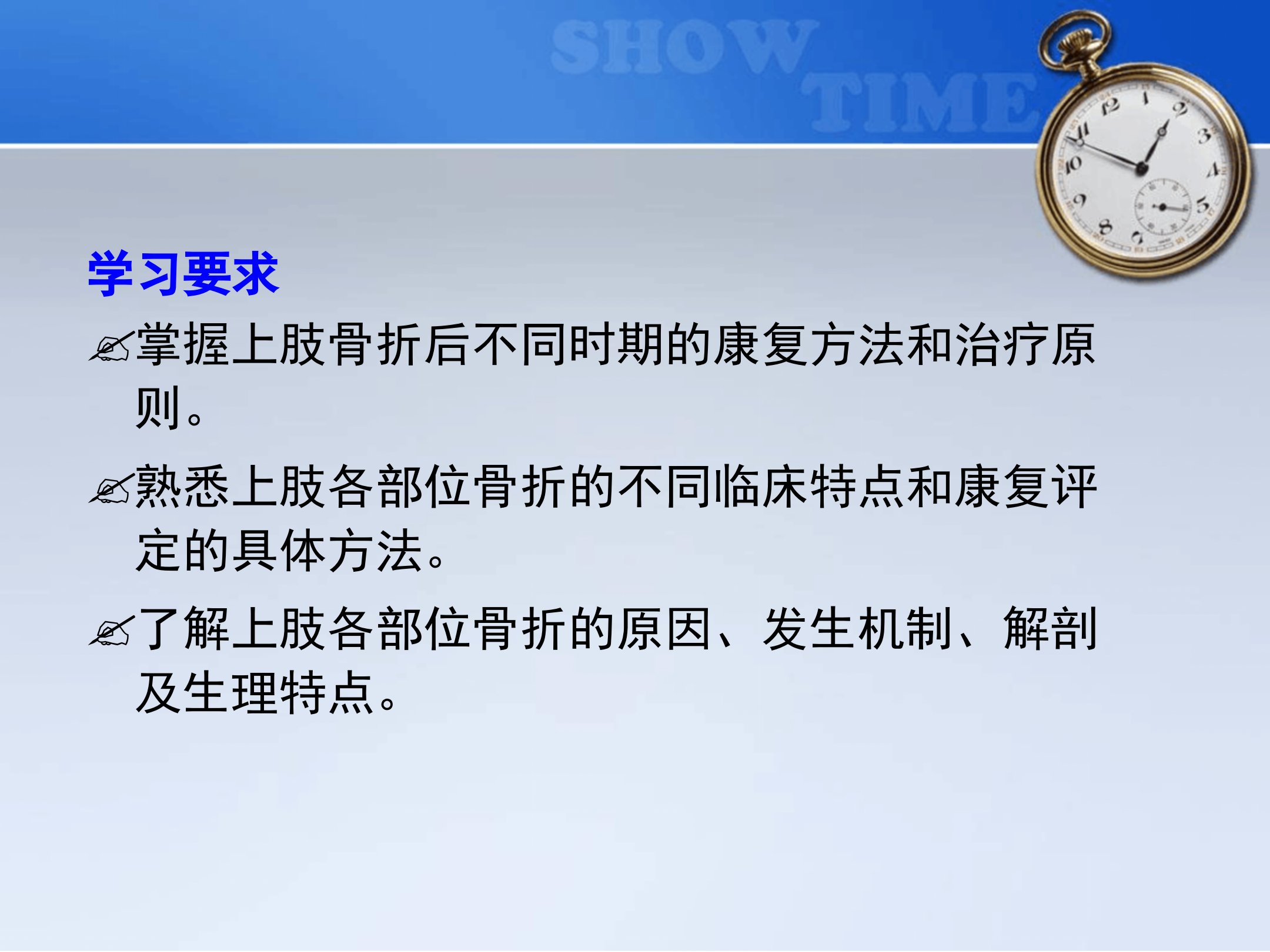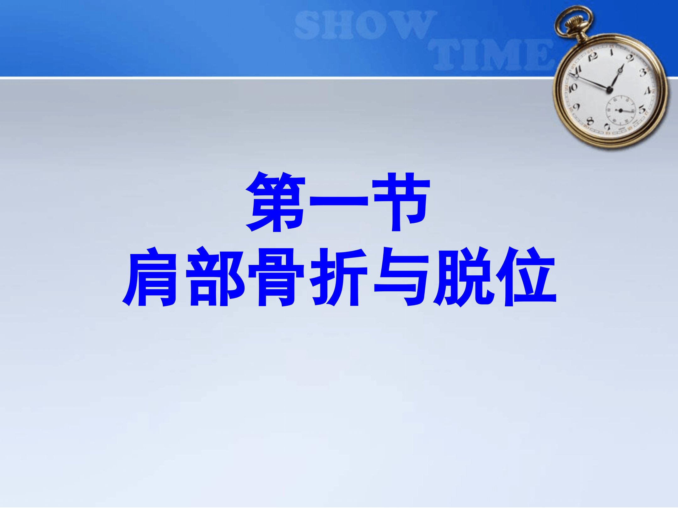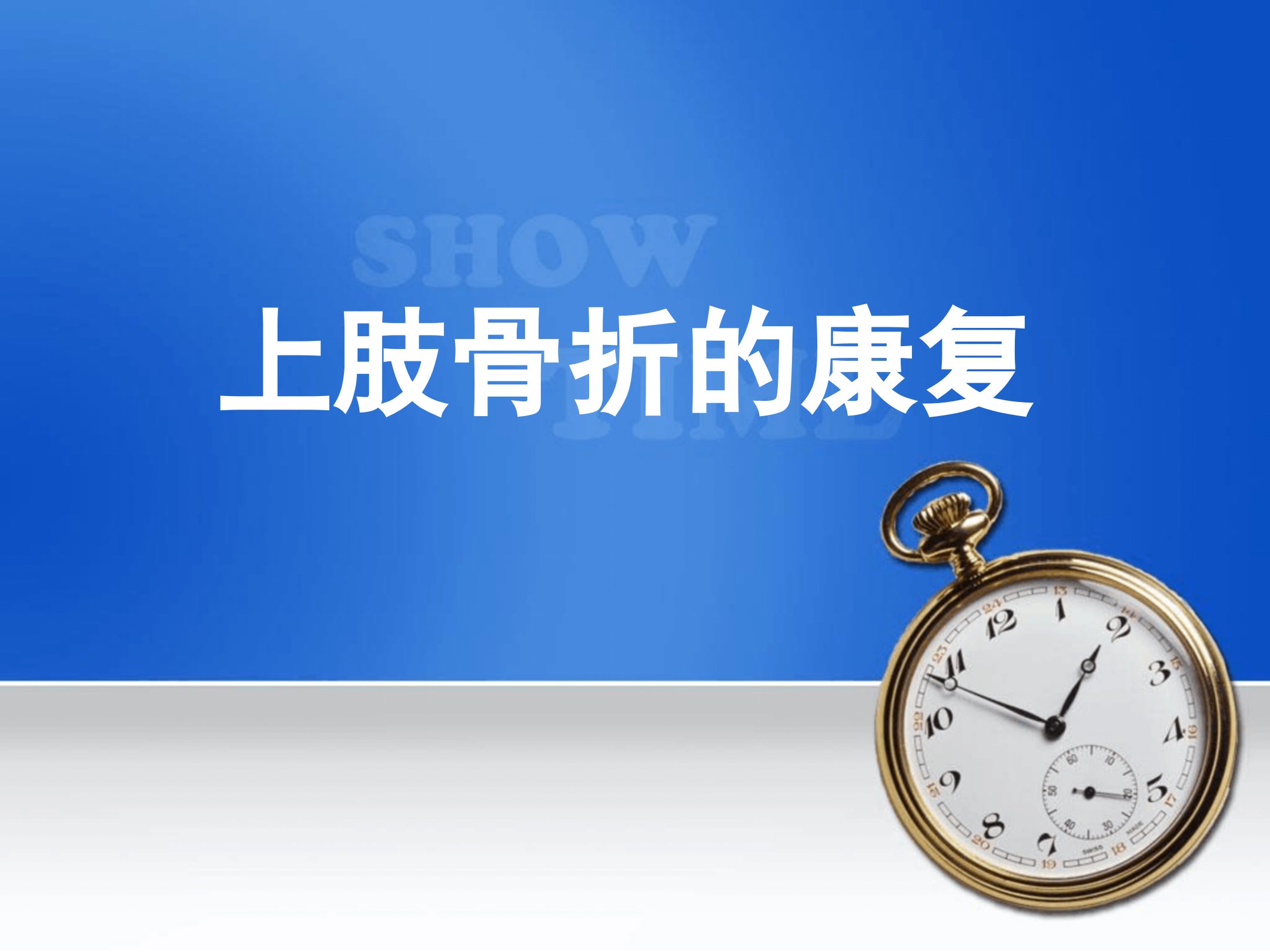 上肢骨折的康复学习要求?掌握上肢骨折后不同时期的康复方法和治疗原则。?熟悉上肢各部位骨折的不同临床特点和康复评定的具体方法。?了解上肢各部位骨折的原因、发生机制、解剖及生理特点。第一节肩部骨折与脱位骨折愈合过程血肿机化演进期需要2-3周原始骨痂形成期临床愈合期需要4-8周骨痂改造形成期需要8-12周一、概述肩关节是人体关节中运动范围最大和最灵活的关节,极易受到外界伤害,导致骨折或脱位。最常见的为锁骨骨折和肩锁关节脱位、肩关节脱位。(一)锁骨骨折以青少年为多见,一般为暴力所导致,常为间接暴力所致。儿童常常为青枝骨折,而成年人多为斜行或粉碎性骨折,好发部位在锁骨中段最为常见,而直接外力可造成不同部...