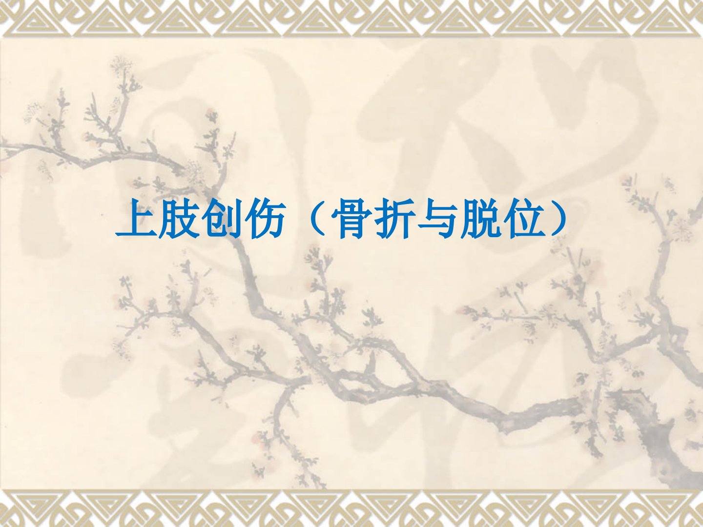 上肢创伤涵盖骨折与脱位涉及上肢带骨(锁骨、肩胛骨)和自由上肢骨(肱骨、桡尺骨等)。锁骨骨折常见于中段间接暴力多致中段骨折近折端上后移位远折端前下移位表现为患肩下垂、头偏伤侧。非手术治疗适用于青枝、无移位骨折手术治疗则针对难复位、合并损伤等情况。肩关节脱位占全身关节脱位50多见于青壮年男性分前、后、下、上脱位以前脱位最常见体征包括方肩畸形、关节囊空虚等常用Hippocrates法复位。肱骨干骨折中下13交界处易伤桡神经表现为局部症状及骨折专有体征重点检查桡神经功能。肱骨髁上骨折分伸直型和屈曲型易伤及肱血管及正中、尺、桡神经。肘关节脱位以后脱位多见表现为肘部疼痛、肿胀、畸形等手法复位失败需手术。尺桡骨骨折需警惕骨筋膜室综合症桡骨远端骨折多为间接暴力所致包括伸直型、屈曲型和关节面骨折伴腕关节脱位。