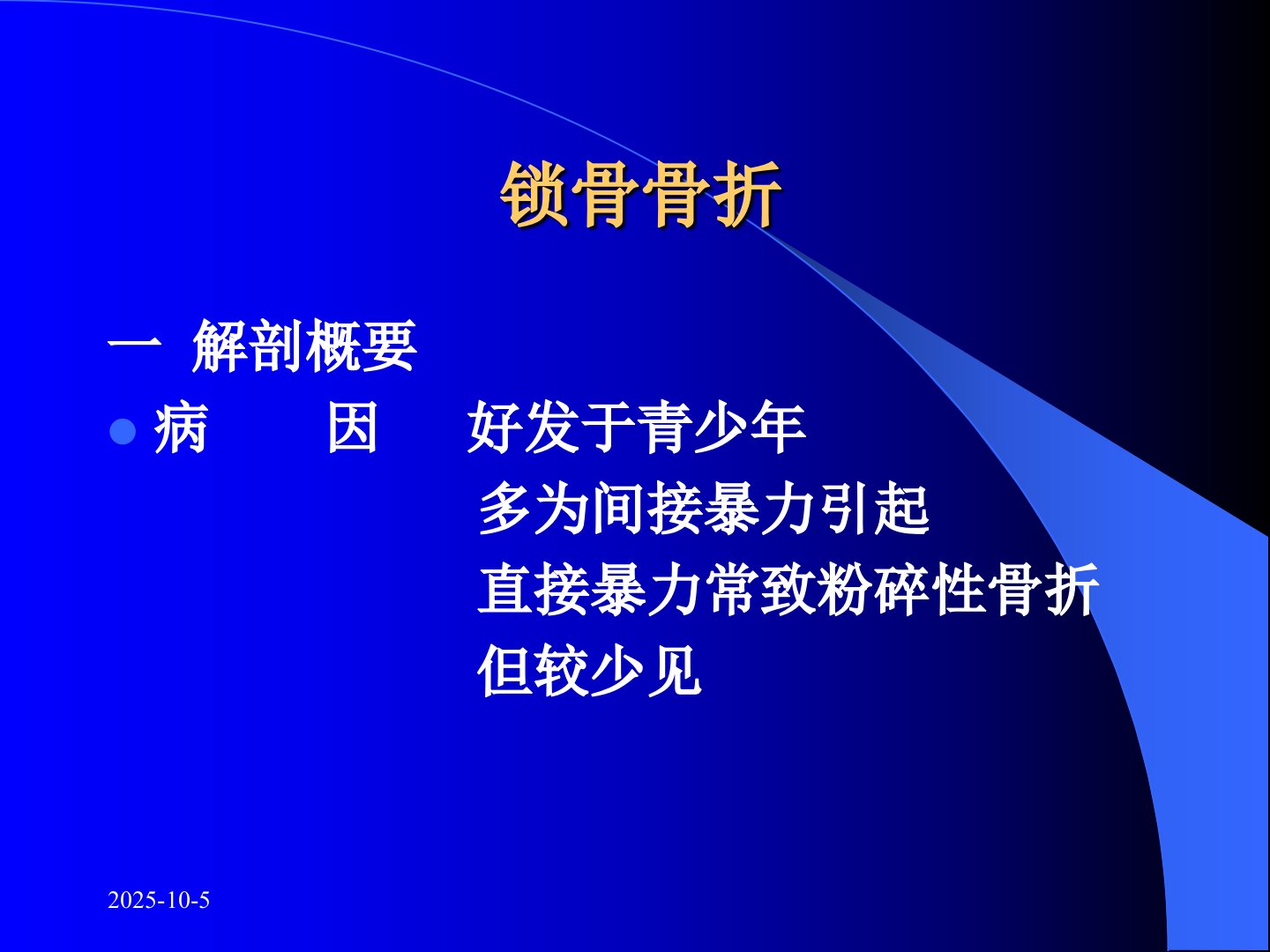 第七十七章上肢骨折锁骨骨折一解剖概要病因好发于青少年多为间接暴力引起直接暴力常致粉碎性骨折但较少见二分类锁骨中份多见锁骨内端少见锁骨外端分三型移位方向近端向上远端向下儿童锁骨骨折多为青枝骨折成人多为斜形、粉碎形骨折锁骨发生开放性骨折的机会较少若移位明显可引起臂丛神经损伤三临床表现和诊断症状疼痛肩关节活动使疼痛加重体征出现肿胀、瘀斑,可们及骨折端X线拍片暴力作用强大,骨折移位明显,仔细检查上肢的神经功能及血供情况,以便对锁骨,骨折合并神经、血管损伤作出正确诊断四治疗保守治疗青枝骨折及成人的无移位骨折仅用三角巾悬吊患肢3—6周即可开始活动有移位的中段骨折复位方法采用手法复位固定方法横形8字绷带固定...