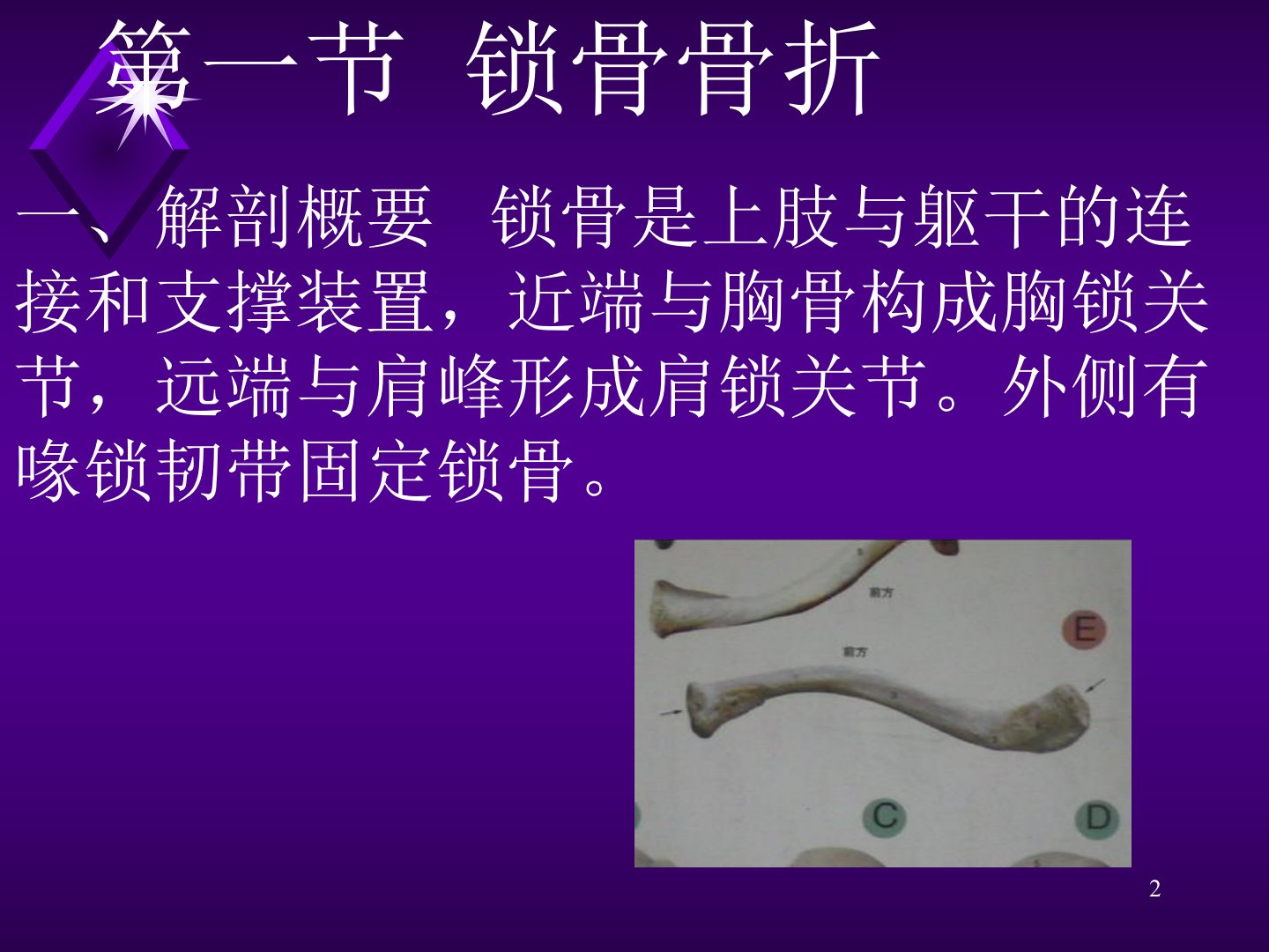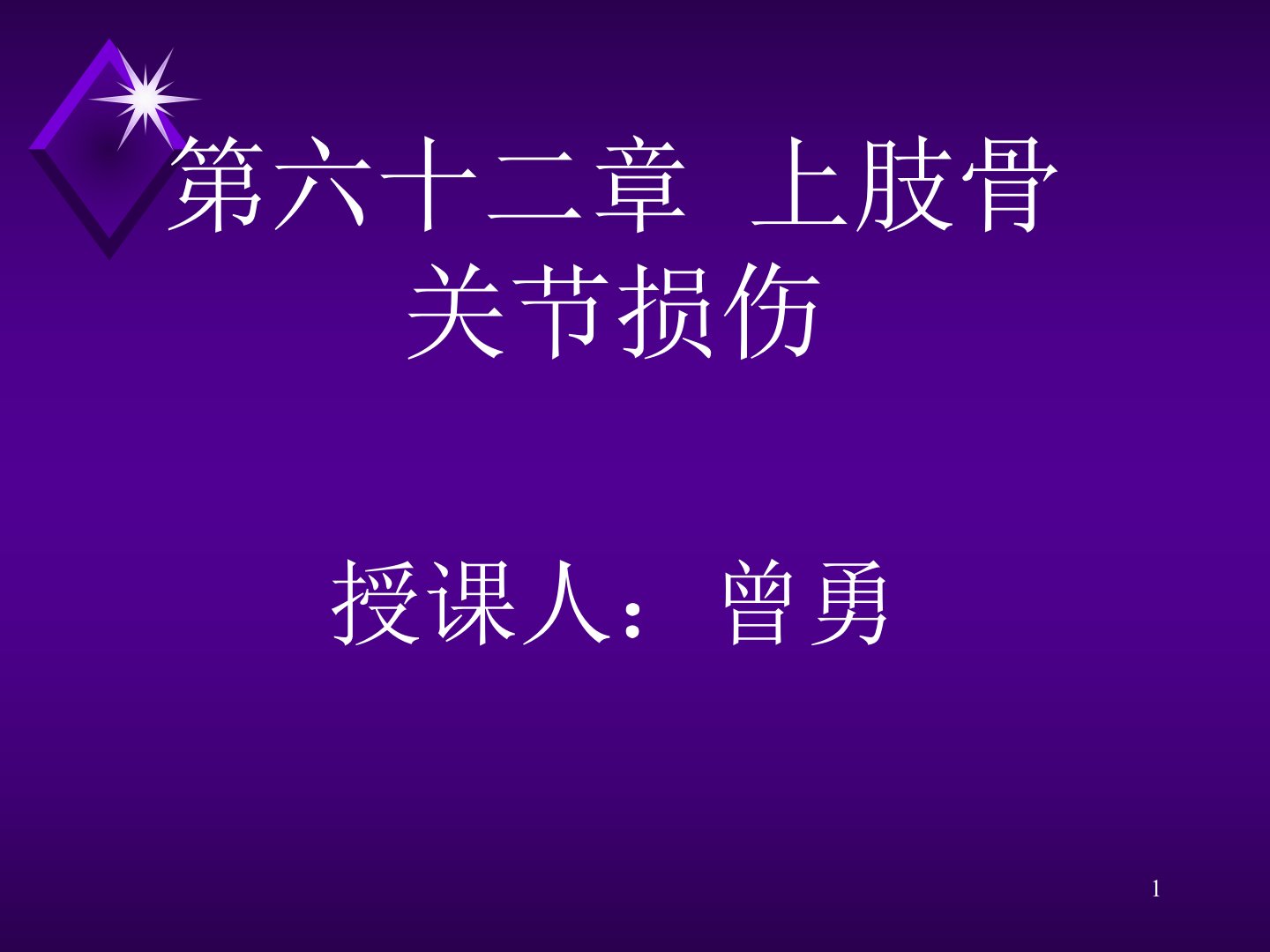 第六十二章上肢骨关节损伤摘要本章由曾勇授课详述上肢骨关节损伤。锁骨骨折多见于青少年由间接或直接暴力引起表现为肿胀、瘀斑、肩关节活动受限治疗包括悬吊、手法复位固定和手术。肩锁关节脱位多见于年轻人运动创伤分三型治疗依类型而定。肩关节脱位以前脱位最常见机制包括间接和直接暴力治疗包括复位、固定和功能锻炼。肱骨外科颈骨折中老年人多见暴力作用是主要原因分为无移位型、外展型、内收型和粉碎型治疗依类型包括悬吊、手法复位外固定和手术。肱骨干骨折易损伤桡神经治疗包括手法复位外固定、切开复位内固定和功能锻炼。肱骨髁上骨折易发生于儿童分为伸直型和屈曲型治疗包括手法复位外固定、手术治疗和术后锻炼。肘关节脱位需及早复位固定。桡骨小头半脱位多见于5岁以下小儿治疗为复位。尺桡骨双骨折治疗包括手法复位外固定、切开复位内固定和功能锻炼。桡骨下端骨折发生在松、密质骨交界处。