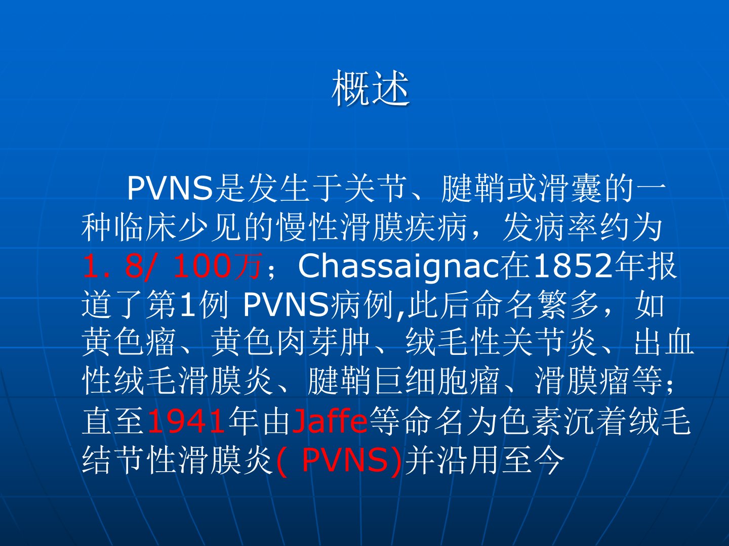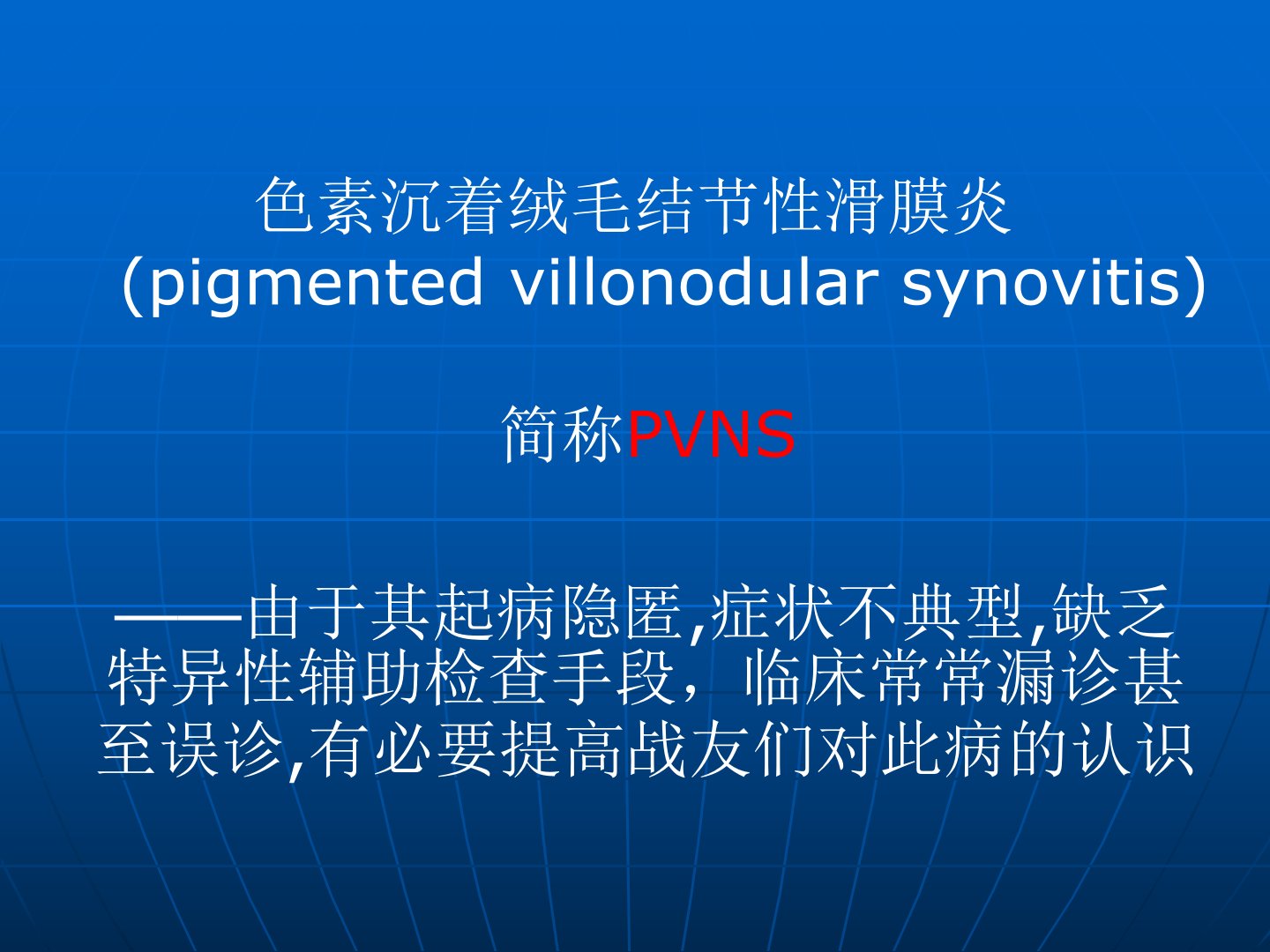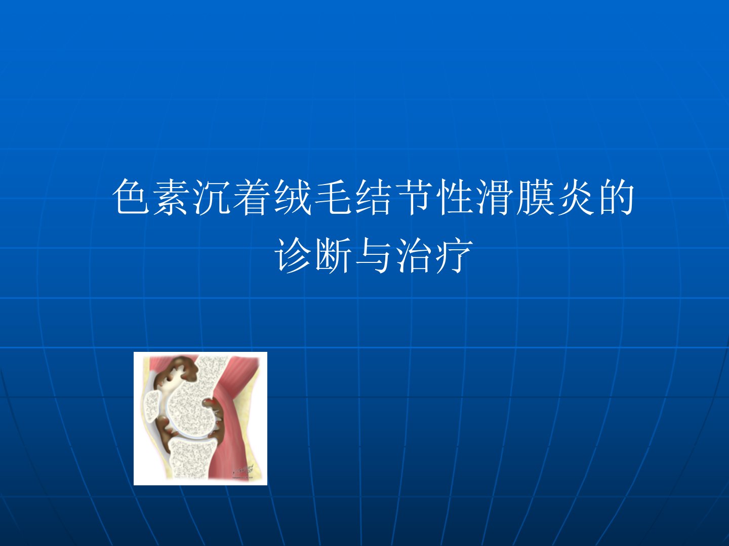 色素沉着绒毛结节性滑膜炎的诊断与治疗色素沉着绒毛结节性滑膜炎(PVNS)是发生于关节、腱鞘或滑囊的慢性滑膜疾病发病率约为18100万多发于2040岁青壮年男性多于女性膝关节为多发部位。其病因不明存在损伤与出血、局部类脂质代谢紊乱、遗传因素、炎症、肿瘤样变性等争议。临床表现上侵犯腱鞘滑膜者手、足部肌腱外会出现缓慢生长的肿块;累及关节时分为局限型和弥漫型常表现为关节周期性慢性疼痛、肿胀等。辅助检查有超声、X线、CT、MRI、关节穿刺液、关节镜及病理检查等其中MRI对膝关节PVS具有定性诊断意义是X线片检查后首选的影像学检查方法。治疗方面提倡全滑膜切除术关节镜术是微创外科新技术疗效已获肯定;放射疗法可预防复发;手术联合放射治疗对弥漫型病例术后常辅以局部放疗;晚期患者可考虑关节置换术。