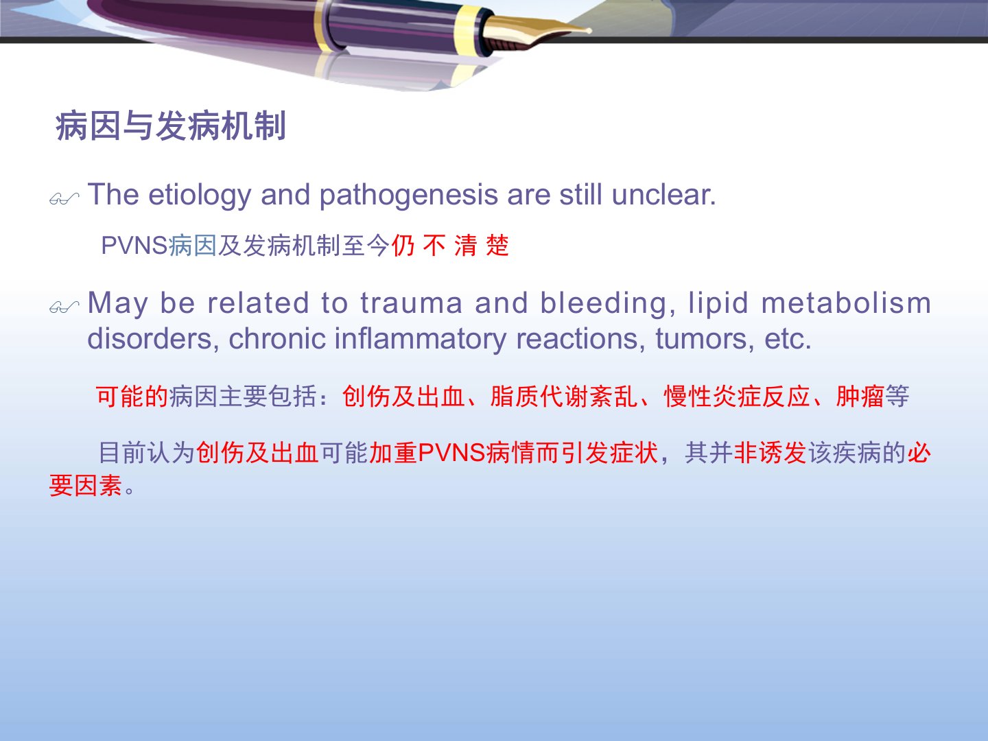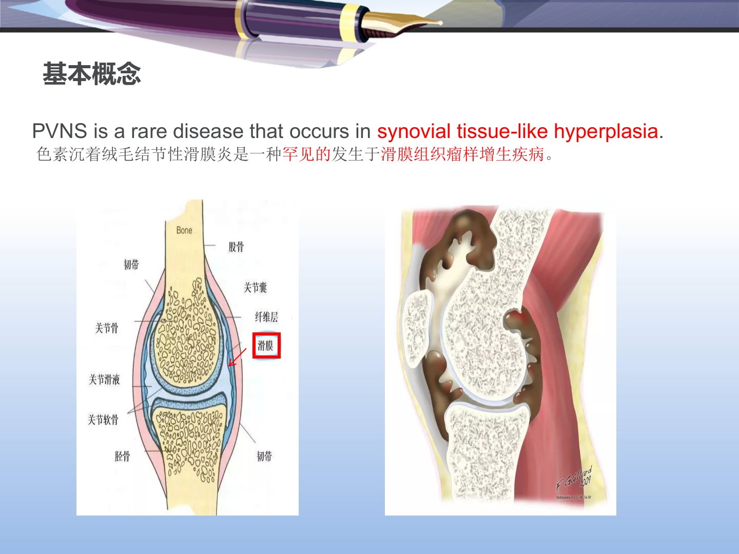 色素沉着绒毛结节性滑膜炎(PVNS)是发生于滑膜组织的瘤样增生罕见病病因不明可能与创伤、脂质代谢紊乱等有关好发于青壮年多为单关节发病慢性病程。PVNS分局限型(LPVNS)和弥散型(DPVNS)症状包括肿胀、疼痛及功能受限。辅助检查方面X线缺乏早期诊断价值CT可确定病变侵袭范围MRI是最佳诊断手段T2低信号是PVNS特征性表现关节镜检查可清晰看见关节内病灶病理检查是确诊金标准。治疗方面彻底清除病变滑膜组织是关键包括手术、手术联合放疗、生物靶向治疗。LPVNS通常可在关节镜下全部切除预后良好;DPVNS治疗包括开放性手术、关节镜手术、关节镜联合开放性手术及关节置换关节镜手术疗效得到多数学者认可。由于DPVNS有广泛侵袭生长甚至恶变的特点术后常用放疗辅助治疗。生物靶向治疗提供了新思路但缺乏研究支持尚未广泛应用。