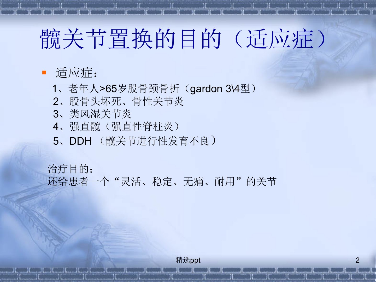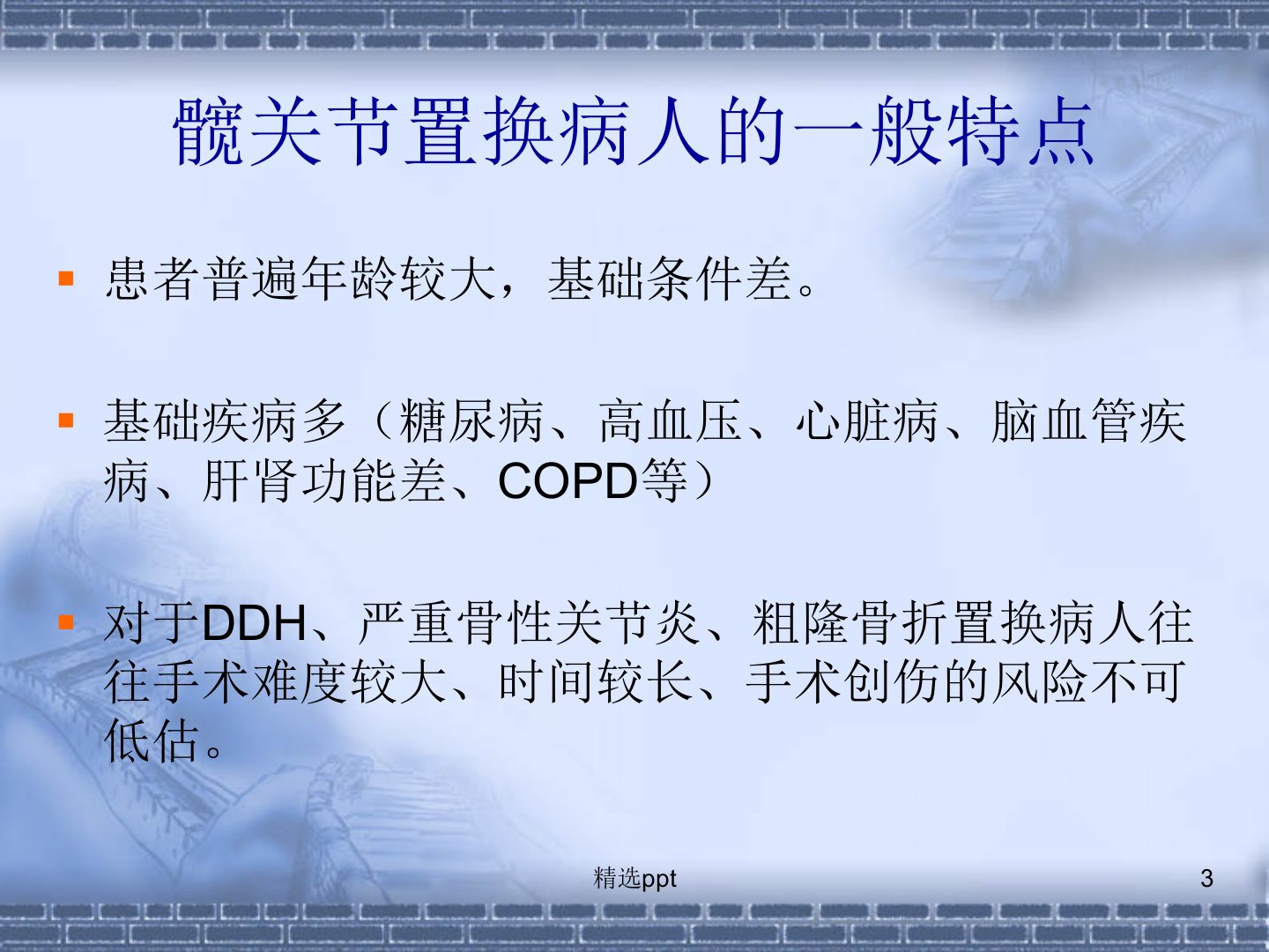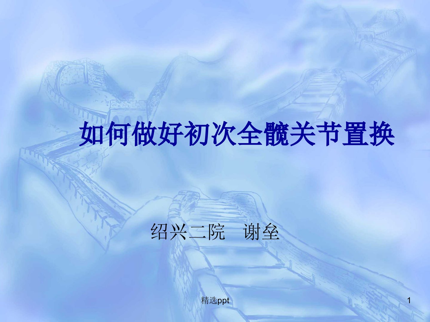 如何做好初次全髋关节置换绍兴二院谢垒打精选ppt髋关节置换的目的(适应症)适应症:1、老年人>65岁股骨颈骨折(gardon34型)2、股骨头坏死、骨性关节炎3、类风湿关节炎4、强直髋(强直性脊柱炎)5、DDH(髋关节进行性发育不良)治疗目的:还给患者一个“灵活、稳定、无痛、耐用”的关节精选ppt髋关节置换病人的一般特点患者普遍年龄较大,基础条件差。基础疾病多(糖尿病、高血压、心脏病、脑血管疾病、肝肾功能差、COPD等)对于DDH、严重骨性关节炎、粗隆骨折置换病人往往手术难度较大、时间较长、手术创伤的风险不可低估。精选ppt美国麻醉医师协会(ASA)病情分级Ⅰ正常健康。Ⅱ轻度系统疾病。Ⅲ严重...