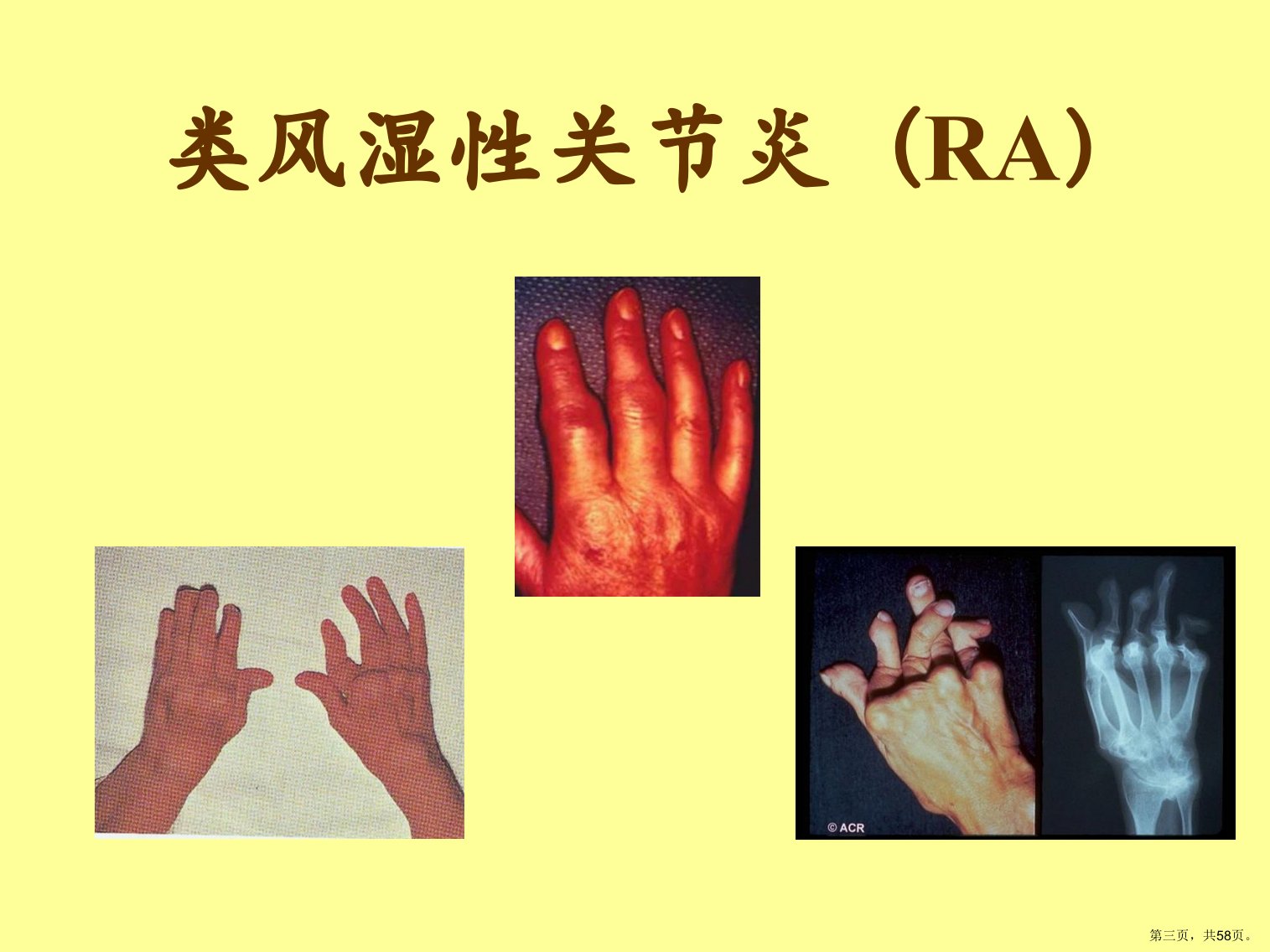 类风湿关节炎是一种以小关节慢性炎症为主的自身免疫性疾病临床特点为对称性多关节炎表现为慢性肿胀、疼痛、晨僵及功能障碍早期有关节破坏晚期则致关节畸形、强直。我国类风湿关节炎患病率为0364050岁为高峰年龄女性多发。其病因尚不明确一般认为与遗传、感染、内分泌、免疫学异常及其他因素有关。临床表现包括关节疼痛、肿胀、晨僵、活动障碍及畸形近端指间关节、掌指关节和腕关节为“靶关节”。关节外表现有类风湿结节、类风湿性血管炎等。实验室检查包括类风湿因子、血沉、C反应蛋白等放射学检查和MRI对诊断有重要意义。治疗目的在于控制和预防关节破坏提高生活质量治疗原则为早期、规范、长程及个体化包括教育、物理治疗、药物、手术等。75病人需长期治疗15病人虽积极治疗但不能控制病情。