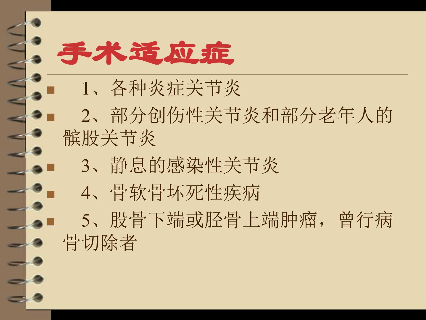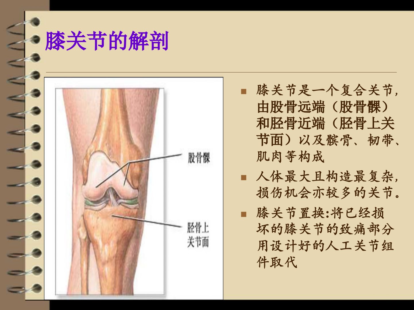 膝关节是人体最大且构造复杂的关节。人工膝关节置换术适用于炎症、创伤性、感染性关节炎等多种病症。术后护理包括:一般护理如术后6小时去枕平卧之后保持患肢抬高中立位密切观察患肢肢端血运;并发症护理如预防术后感染需严密观察患者体温保持伤口干燥及时更换污染敷料预防肺部感染需教会患者深呼吸及有效咳嗽预防压疮需保持床单干燥清洁定时翻身预防血肿需术前停用相关药物观察引流管情况;出血护理包括术前询问病史、预存自体血术后及时回输引流血密切观察生命体征;疼痛护理可使用自控镇痛泵;下肢静脉血栓预防包括术后抗凝药物预防不宜双下肢同时应用静脉泵鼓励病人早期活动穿弹力袜抬高患肢。功能锻炼分四阶段:术后02天进行肌肉等长收缩和踝关节运动;术后35天增加肌力训练和膝关节主被动伸屈活动;术后6天2周加强肌力和活动度训练并进行步态训练;出院后继续增加活动度和负重能力训练。假体保护方面应避免蹲跪、过度扭曲膝关节选择适合运动控制体重。出院后需注意伤口护理、休息、饮食、复查及预防关节感染等事项。