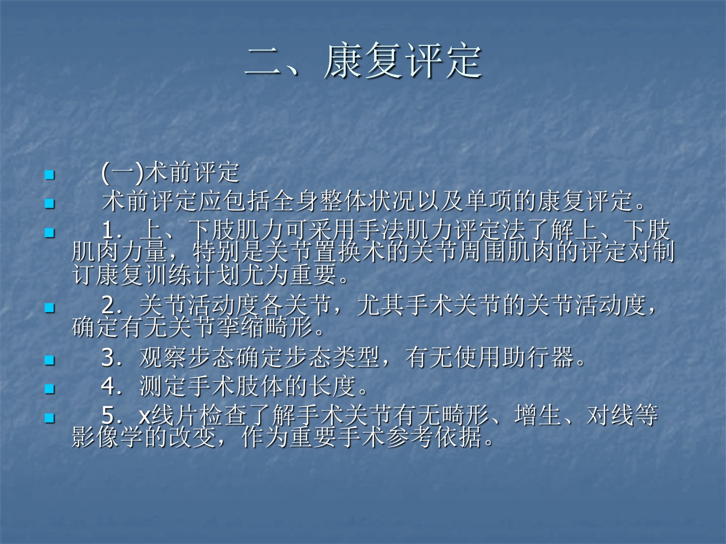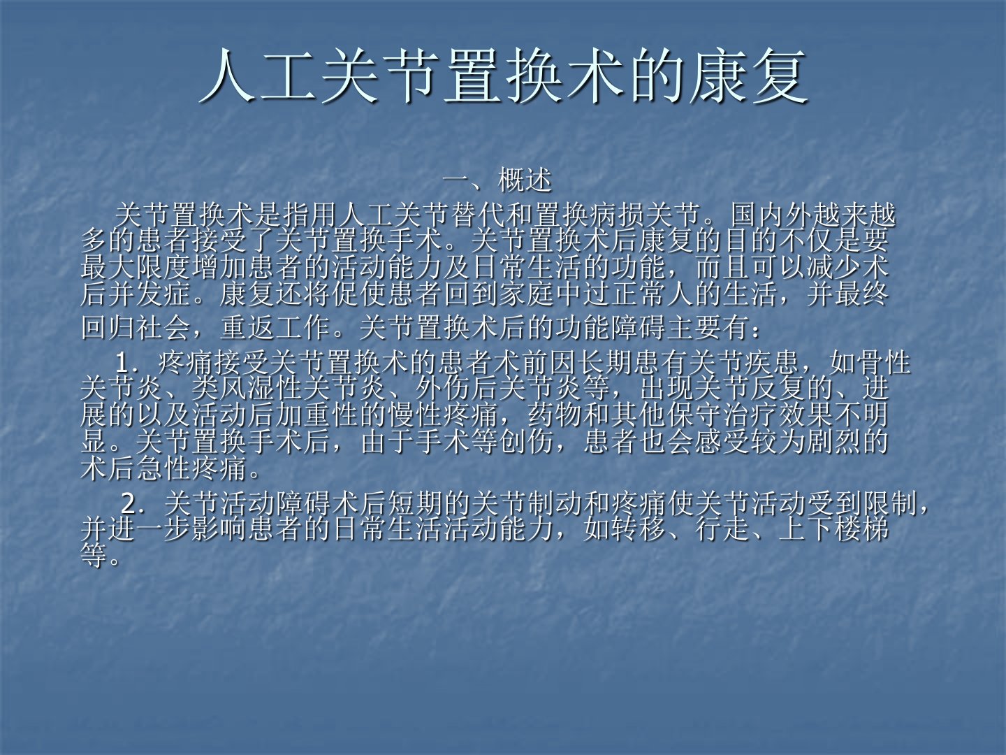 关节置换术是用人工关节置换病损关节术后康复旨在增加患者活动能力、减少并发症助其回归正常生活与工作。术后功能障碍主要有疼痛和关节活动障碍。康复评定包括术前和术后评定前者涵盖全身整体状况及单项康复评定如上、下肢肌力、关节活动度、步态等;后者包括住院患者心肺功能、伤口情况、关节水肿、疼痛、活动状况等评定以及门诊随访。康复治疗分术前术后术前包括康复教育、肌力训练、呼吸训练、术后训练方法教学及辅助器具使用指导;术后有消肿止痛(冰疗、经皮神经电刺激)、体位摆放、肌力训练、关节活动范围训练、转移能力训练、负重练习和步态训练、功能性独立能力训练。此外还需注意处理下肢深静脉血栓形成、脱位、异位骨化等并发症。