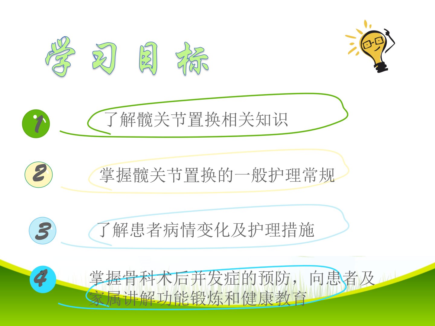 本次教学查房由骨科吴老师指导学习目标为了解髋关节置换相关知识、护理常规、病情观察、并发症预防及健康教育。患者李某76岁男性因骑自行车跌倒致左股骨颈骨折入院有脑梗死、冠心病等多种病史。入院后做好术前准备包括告知手术信息、训练床上活动、皮肤及胃肠道准备等后行左半髋关节置换术。治疗护理方面搬运时保持外展位防脱位术后密切观察生命体征、伤口及引流液等情况。常见护理诊断包括疼痛、感染、压疮风险、知识缺乏及焦虑等。护理措施包括疼痛管理、伤口感染预防、压疮预防、知识教育及心理疏导。并发症预防包括DVT使用压力泵治疗仪抗血栓治疗、假体脱位用T型枕固定、感染保持管道引流通畅尽早拔管。康复训练包括踝泵运动、股四头肌锻炼、屈髋屈膝和直腿抬高运动等并注意预防假体脱位。