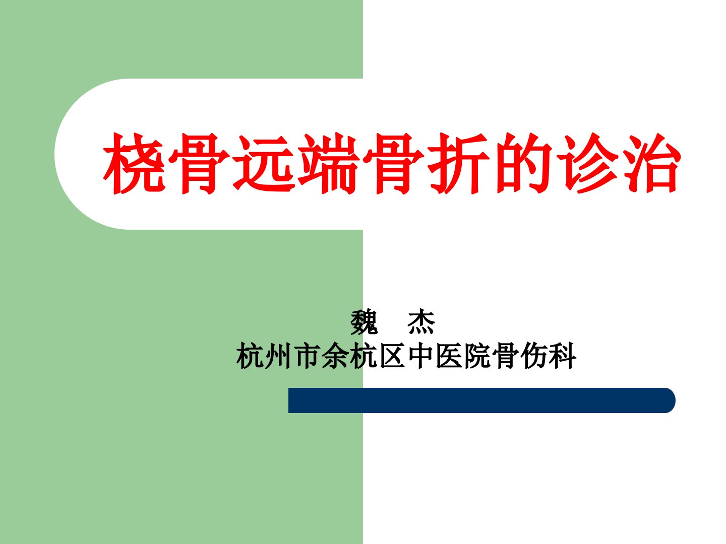 桡骨远端骨折的诊治摘要本文由杭州市余杭区中医院骨伤科魏杰分享桡骨远端骨折诊治要点。桡骨远端骨折是临床常见多发病多见于老年骨质疏松骨折、幼年骨骺损伤及暴力外伤骨折。诊断需与腕骨其他骨折鉴别骨折类型上还要与正中神经损伤、多处软组织挫伤、颜面部擦伤鉴别。治疗分保守与手术保守采用手法复位石膏、夹板外固定手术则切开复位内固定或外固定支架固定同时配合中医中药骨折三期辩证用药。治疗要求关节面解剖复位塌陷小于2mm纠正骨骼力线。治疗时待肿胀消退可再次手法复位石膏固定也可直接手术内固定。治疗中石膏固定要告知风险严密观察;手术治疗要告知相关风险定期复查拍片。术后指导关节功能锻炼及负重。最后给出复习建议推荐阅读外科学骨科部分及相关经典著作、杂志。