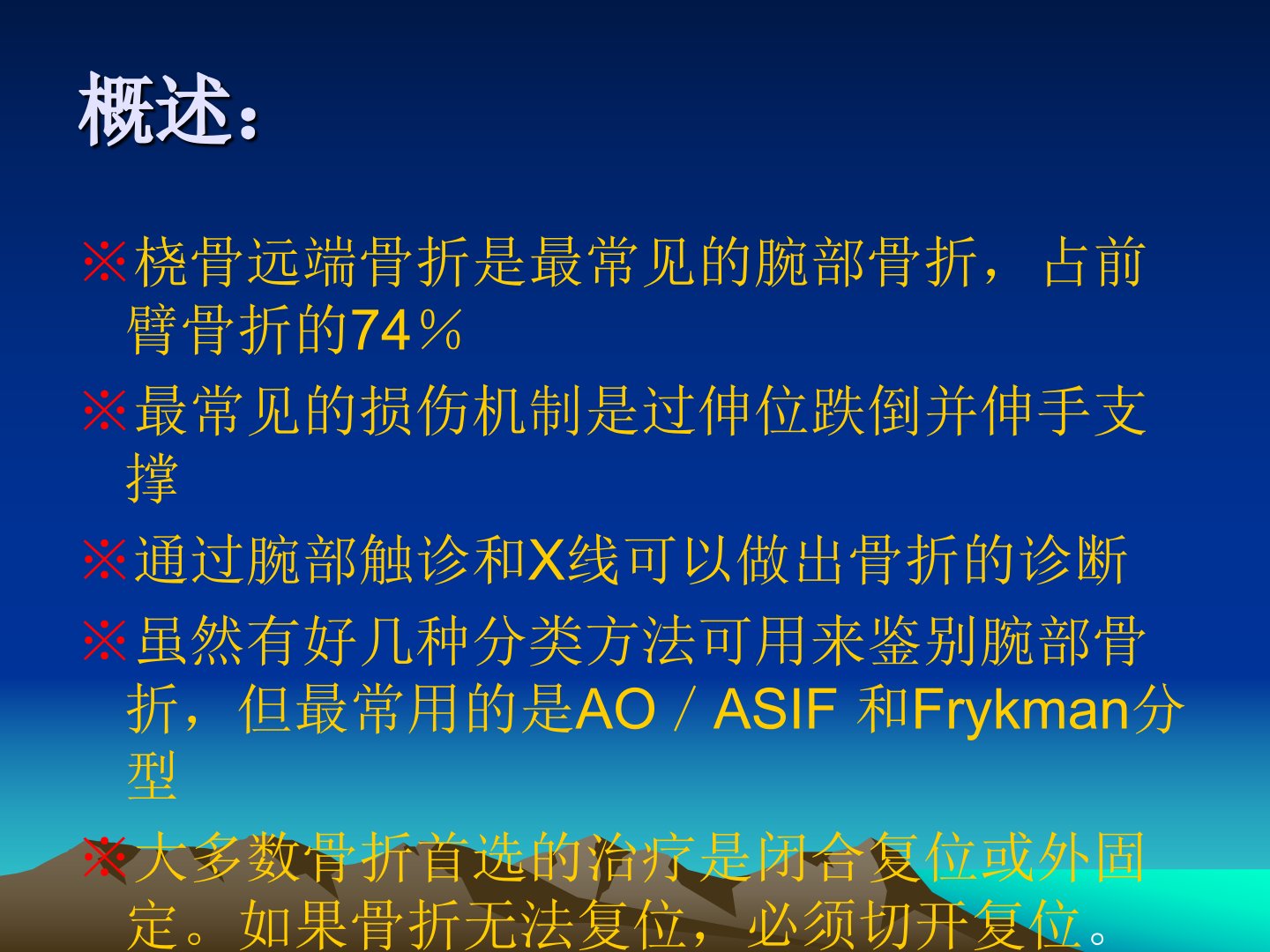 桡骨远端骨折是最常见的腕部骨折占前臂骨折的74距桡骨远端关节面3cm以内为解剖薄弱处易发骨折。其发病率约占急诊骨折病人的17其中关节内骨折占25主要发生在青少年和中老年两个年龄段。病因分型上桡骨远端骨折分类方法多临床最常用AOASIF分类系统分为关节外骨折A型、部分关节内骨折B型及复杂关节内骨折C型3种基本类型每型再分3组附加尺骨损伤可产生多种组合型式。治疗原则方面治疗方法选择取决于是否存在潜在不稳定无移位稳定骨折或有移位复位后可维持稳定的骨折采用闭合复位石膏夹板外固定;骨折原始移位严重、关节内粉碎骨折等不稳定骨折应考虑手术治疗。治疗方法包括闭合复位石膏夹板外固定、经皮穿针复位固定、外固定支架的应用、切开复位内固定、腕关节镜辅助下复位固定、人工腕关节置换、骨或骨替代物移植等。