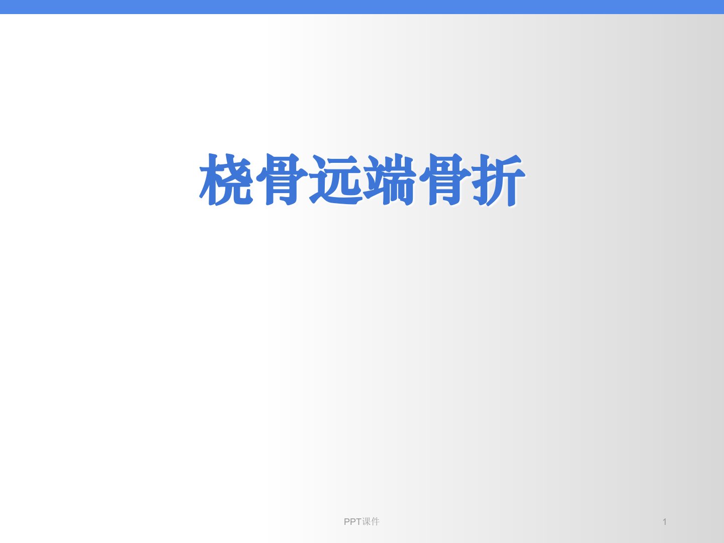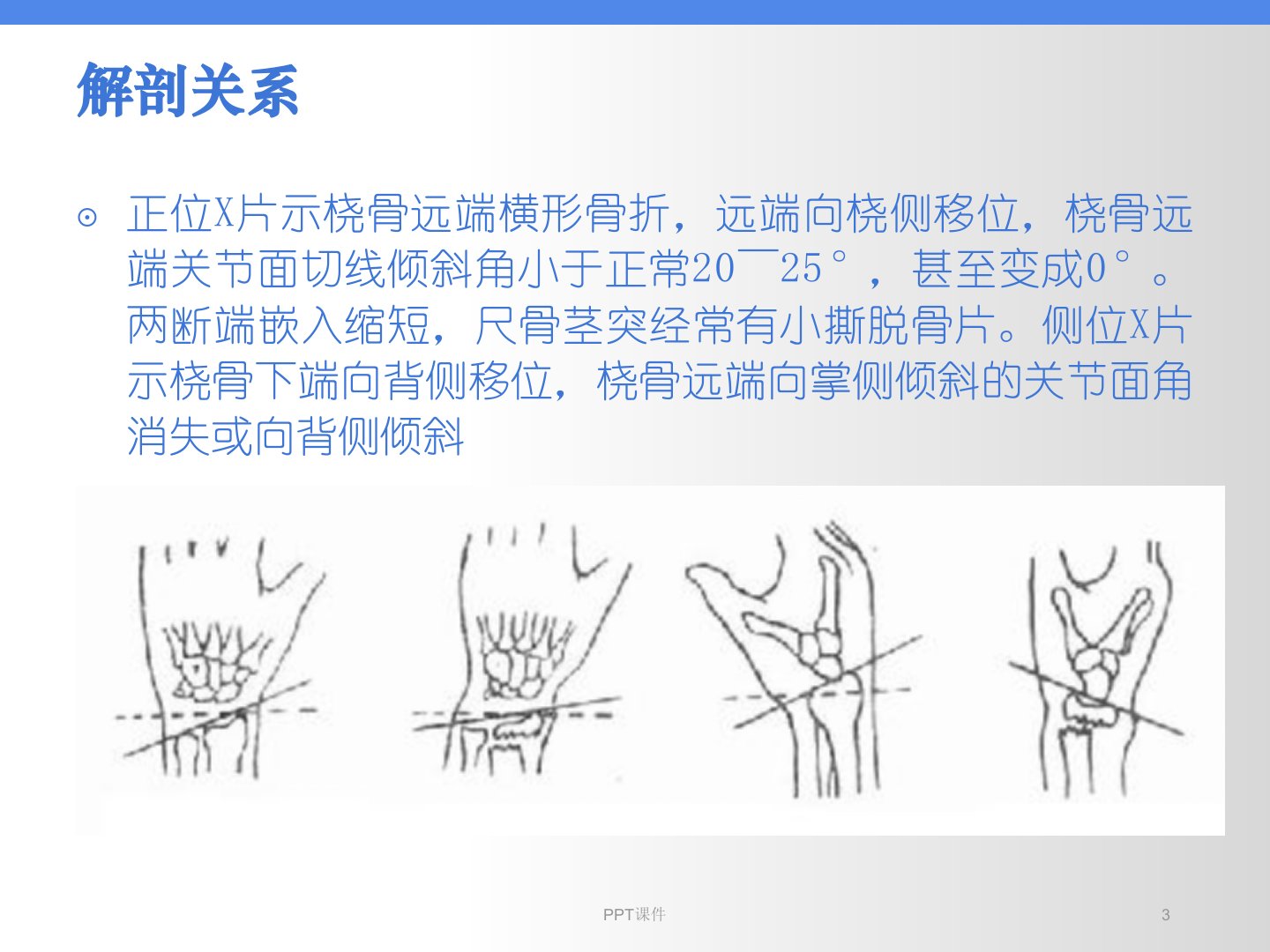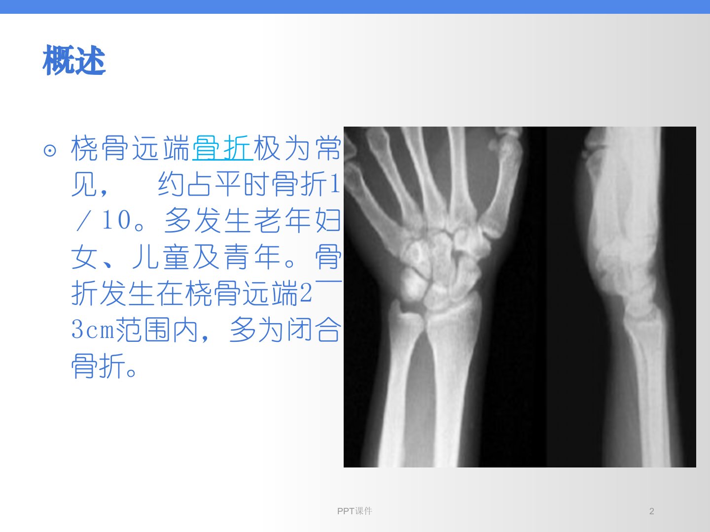 桡骨远端骨折PPT课件摘要桡骨远端骨折极为常见约占平时骨折的110多发生于老年妇女、儿童及青年骨折多发生在桡骨远端23cm范围内且多为闭合骨折。正位X片显示桡骨远端横形骨折远端向桡侧移位;侧位X片显示桡骨下端向背侧移位。患者常感腕部疼痛肿胀活动受限严重移位者可出现餐叉状畸形。X线检查是主要辅助检查手段可显示典型移位特征包括桡骨远端骨折块向背侧、桡侧移位桡骨短缩等。骨折类型包括伸直型(Colles骨折)、屈曲型(Smith骨折)、背侧缘劈裂型、掌侧缘劈裂型。治疗上无移位骨折可用功能位石膏托或小夹板固定;移位型骨折需闭合复位后固定。畸形愈合的治疗根据畸形程度选择不同手术方式。并发症包括畸形愈合、下尺桡关节脱位、正中神经卡压、严重创伤性腕关节炎、前臂筋膜室综合征。预防重点在于及时门诊复查、防止肌腱神经损伤、控制旋前移位及早期正确功能锻炼。
