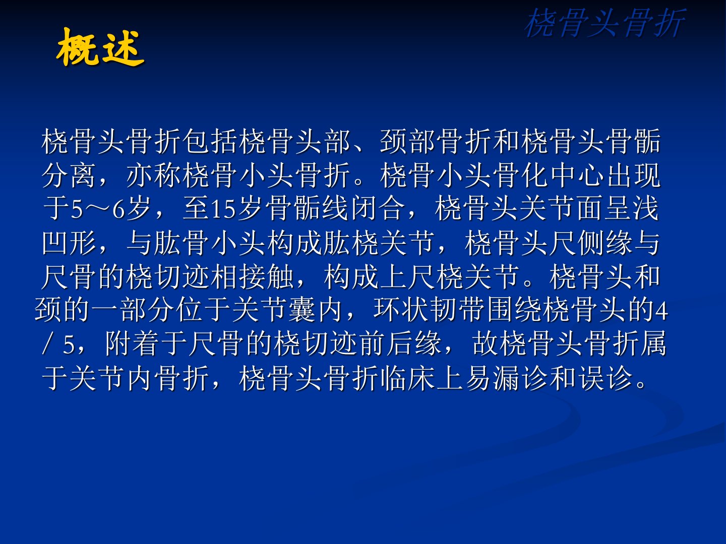 桡骨头骨折摘要教学目的了解桡骨头骨折相关内容。概述桡骨头骨折包括桡骨头部、颈部骨折和桡骨头骨骺分离属关节内骨折易漏诊误诊。解剖部位涉及上桡尺关节、肱桡关节等部位。病因主要为间接外力所致如摔倒时肘关节特定位置外力沿桡骨传导致桡骨头和肱骨头撞击或肘关节过度外展使桡骨头外侧缘受冲击力。病理桡骨头轮廓可完全破坏或仅有裂缝无移位骨折等还可能同时损伤肱骨头、肘关节内侧副韧带等。临床分型包括青枝骨折、裂缝骨折、劈裂骨折、粉碎骨折、嵌插骨折、嵌插合并移位骨折等。诊断肘部受伤后桡骨周围有显著肿胀、压痛等症状应考虑桡骨头骨折需注意是否合并桡神经损伤及时拍片诊断。治疗1保守治疗:无移位或移位不多不影响旋转功能的局麻下手法复位石膏托固定等。2手术治疗:切开复位、钢针拔正法、桡骨头切除术。药物治疗分早、中、后期分别采用活血化瘀、接骨续损、紧骨壮筋等药物。预后早期桡骨头切除术功能恢复满意但肘关节伸直受限治疗不及时后期会造成功能障碍或创伤性关节炎。