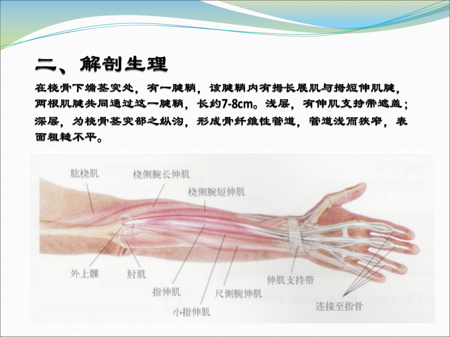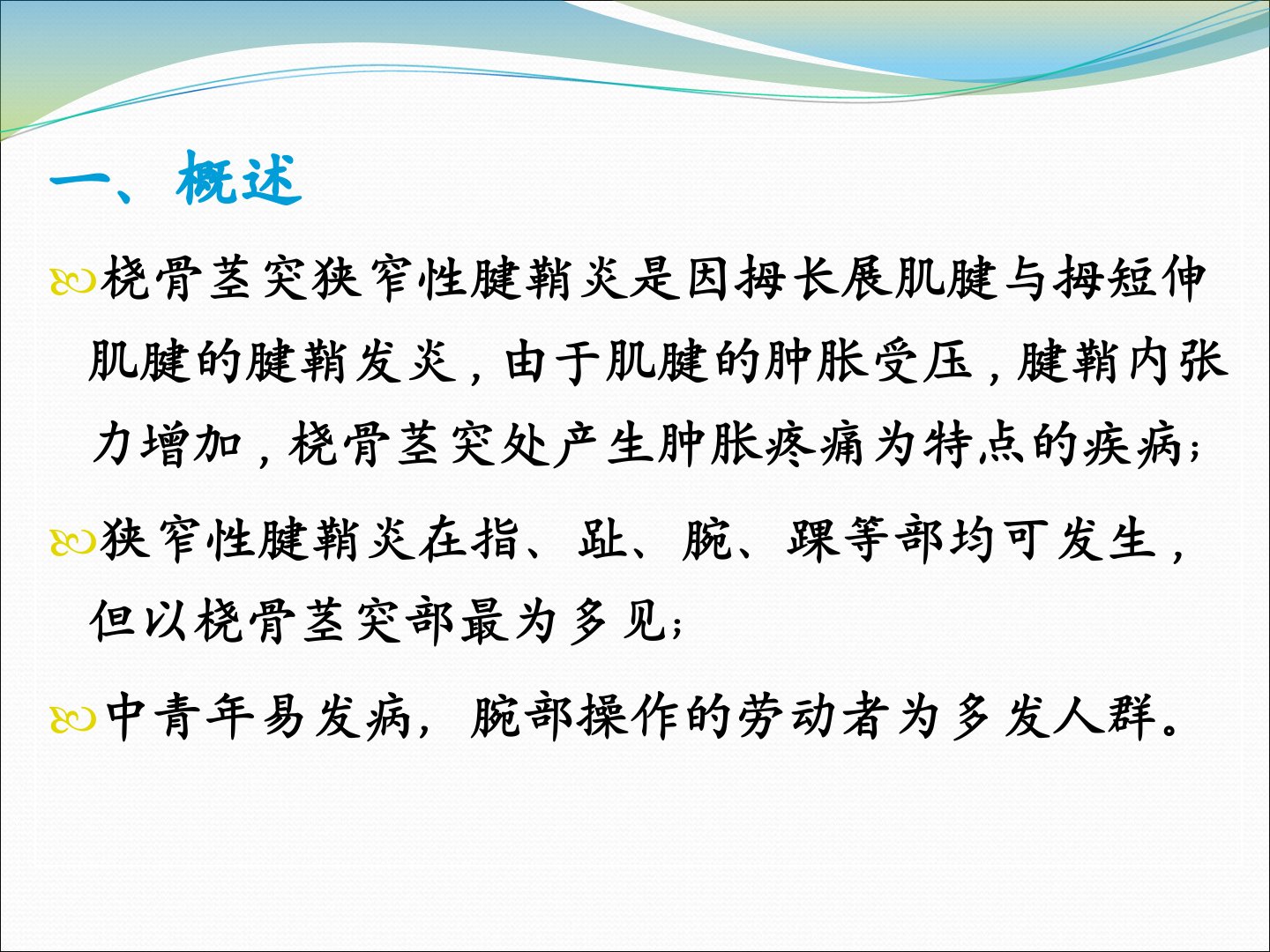 桡骨茎突狭窄性腱鞘炎因拇长展肌腱与拇短伸肌腱的腱鞘发炎导致肌腱肿胀受压桡骨茎突处肿胀疼痛。该病在指、趾、腕、踝等部均可发生但桡骨茎突部最为多见中青年、腕部劳动者易发。其病因主要是手腕部过度使用肌腱在腱鞘内频繁摩擦引发无菌性炎症导致腱鞘管壁增厚、粘连或狭窄。临床表现包括起病隐匿、发展缓慢桡骨茎突部疼痛并可上下放散寒冷刺激加重拇指功能受限病久可见大鱼际萎缩。检查可见桡骨茎突部肿胀、压痛部分有摩擦感或条索状肿物。诊断依据包括疼痛、肿胀、压痛、拇指功能障碍等。鉴别诊断需与腕舟骨骨折、下尺桡关节损伤区分。推拿治疗以舒筋活血、松解粘连为原则取手三里等穴位采用滚、按、揉等手法。治疗期间手法宜轻柔避免腕关节过度运动及低温刺激并加强拇指功能锻炼。