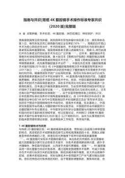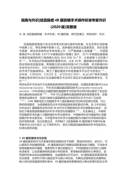 指南与共识|结直肠癌4K腹腔镜手术操作标准专家共识(2020版)完整版关键词结直肠肿瘤;手术标准;4K腹腔镜;淋巴结清扫;神经保护;共识结直肠癌是我国乃至全世界常见的消化道恶性肿瘤,在全世界女性肿瘤中居第2位,男性肿瘤中居第3位。该肿瘤在多数发达国家高发,而在发展中国家,其总体发病率近年来持续上升,已严重威胁人类健康[1]。中国国家癌症中心发布的《2019中国癌症统计数据》显示:2015年我国结直肠癌估算新发病例和死亡病例数分别为38.8万和18.7万,分别居第3位和第5位[2]。手术是治疗结直肠癌的重要手段。过去30年,腹腔镜在结直肠外科的应用持续迅猛发展。美国国立综合癌症网络(NCCN)指...