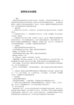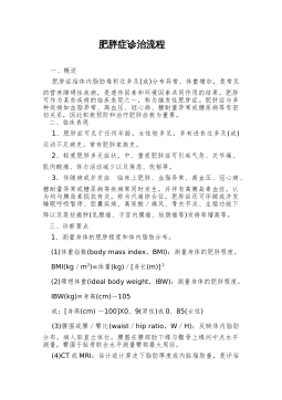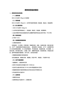 肥胖症临床路径摘要:本临床路径针对BMI28kgm且合并代谢异常疾病(如高血糖、高血压等)或肥胖并发症(如脂肪性肝炎、睡眠呼吸暂停综合症等)的患者。标准住院日不超过14天。住院期间需进行体格检查、三大常规、肝肾功能等多项必需检查并根据病情选择动态血糖监测、肿瘤标志物等额外检查。治疗方案包括健康教育、心理疏导、低热卡饮食(8001200kCal天)、运动疗法(每天3060分钟中等强度体力活动)以及根据代谢异常和合并症选择的治疗药物和方式同时评估是否需进行代谢手术。出院标准包括病情评估完成治疗或手术方案明确。临床路径执行表单详细记录了患者从入院到出院的诊疗工作、重点医嘱和护理工作确保患者得到全面、系统的治疗与管理。