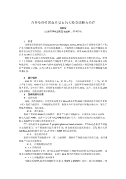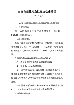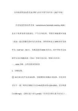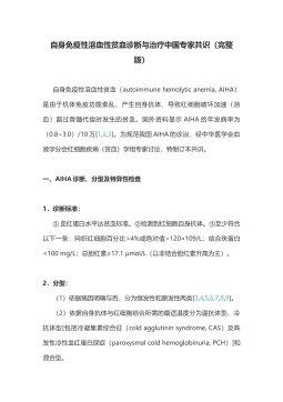 自身免疫性溶血性贫血诊断与治疗中国专家共识(完整版)自身免疫性溶血性贫血(autoimmunehemolyticanemia,AIHA)是由于机体免疫功能紊乱、产生自身抗体、导致红细胞破坏加速(溶血)超过骨髓代偿时发生的贫血。国外资料显示AIHA的年发病率为(0.8~3.0)/10万[1,2,3]。为规范我国AIHA的诊治,经中华医学会血液学分会红细胞疾病(贫血)学组专家讨论,特制订本共识。一、AIHA诊断、分型及特异性检查1.诊断标准:①血红蛋白水平达贫血标准。②检测到红细胞自身抗体。③至少符合以下一条:网织红细胞百分比>4%或绝对值>120×109/L;结合珠蛋白1∶32时即可以诊断CAS...