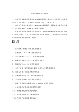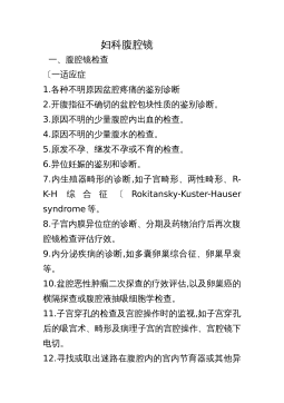 妇科腹腔镜一、腹腔镜检查〔一适应症1.各种不明原因盆腔疼痛的鉴别诊断2.开腹指征不确切的盆腔包块性质的鉴别诊断。3.原因不明的少量腹腔内出血的检查。4.原因不明的少量腹水的检查。5.原发不孕、继发不孕或不育的检查。6.异位妊娠的鉴别和诊断。7.内生殖器畸形的诊断,如子宫畸形、两性畸形、R-K-H综合征〔Rokitansky-Kuster-Hausersyndrome等。8.子宫内膜异位症的诊断、分期及药物治疗后再次腹腔镜检查评估疗效。9.内分泌疾病的诊断,如多囊卵巢综合征、卵巢早衰等。10.盆腔恶性肿瘤二次探查的疗效评估,以及卵巢癌的横隔探查或腹腔液抽吸细胞学检查。11.子宫穿孔的检查及宫腔操...