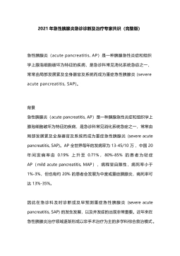 2021年急性胰腺炎急诊诊断及治疗专家共识(完整版)急性胰腺炎(acutepancreatitis,AP)是一种胰腺急性炎症和组织学上腺泡细胞破坏为特征的疾病,是急诊科常见消化系统急症之一,常常由局部发展累及全身器官及系统而成为重症急性胰腺炎(severeacutepancreatitis,SAP)。背景急性胰腺炎(acutepancreatitis,AP)是一种胰腺急性炎症和组织学上腺泡细胞破坏为特征的疾病,是急诊科常见消化系统急症之一,常常由局部发展累及全身器官及系统而成为重症急性胰腺炎(severeacutepancreatitis,SAP)。AP全世界每年的发病率为13-45/10万,...