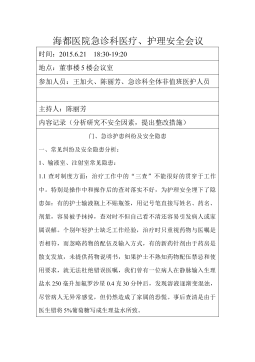 海都医院急诊科医疗、护理安全会议时间:2015.6.2118:30-19:20地点:董事楼5楼会议室参加人员:王加火、陈丽芳、急诊科全体非值班医护人员主持人:陈丽芳内容记录(分析研究不安全因素,提出整改措施)门、急诊护患纠纷及安全隐患一、常见纠纷及安全隐患分析:1、输液室、注射室常见隐患:1.1查对制度方面:治疗工作中的“三查”不能很好的贯穿于工作中。特别是操作中和操作后的查对落实不好,为护理安全埋下了隐患如:有的护士输液瓶上不贴瓶签,用记号笔直接写姓名、药名、剂量,容易被手抹掉,查对时不但自己看不清还容易引发病人或家属误解。个别年轻护士缺乏工作经验,治疗时只重视药物与医嘱是否相符,而忽略药物...