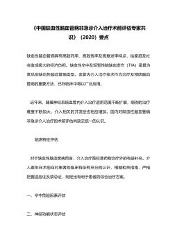 《中国缺血性脑血管病非急诊介入治疗术前评估专家共识》(2020)要点摘要:缺血性脑血管病致死、致残、复发率高给家庭和社会带来沉重经济负担。血管内介入治疗是预防和治疗脑血管病的重要方法但随着其适用范围扩展介入相关并发症也有所增加。国内在缺血性脑血管病非急诊介入治疗术前评估上缺乏统一认识。介入治疗是标准药物治疗外的有益补充介入医生术前应充分认识患者临床特征严格把握适应证及禁忌证。共识推荐:1梳理并把控介入治疗的适应证及禁忌证;2评估并干预卒中危险因素;3评估及干预患者心理状态;4评估患者神经功能状况;5评估心、肺、肾等重要脏器功能及造影剂不良反应风险;6分析缺血性卒中病因。此外还需进行影像学及血流动力学评估、实验室检验评估、药物应用评估落实术前讨论制度责任病变血管确认及手术技术评估制定并发症处理预案综合判断患者预后。