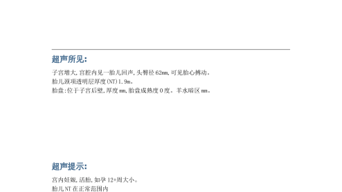 XXXXX医院超声影像检查报告显示患者为女性早孕进行NT检查。超声所见:子宫增大宫腔内有一胎儿头臀径62mm胎心搏动可见。胎儿颈项透明层厚度NT为19m处于正常范围是胎儿唐氏综合症的筛查指标之一。胎盘位于子宫后壁厚度未详细标注成熟度为0度羊水暗区情况未详细描述。超声提示:宫内妊娠活胎大小如孕12周。本报告为产科门诊患者提供仅供临床参考不能作为疾病诊断证明。诊断医师提醒NT检查通过测量胎儿颈项透明层厚度有助于评估胎儿是否存在唐氏综合症等染色体异常风险。