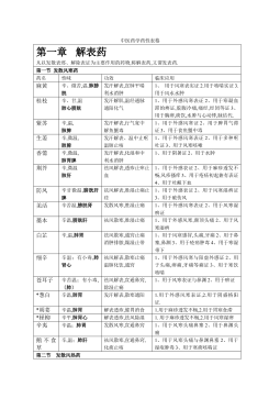 中医药学药性表格第一章解表药凡以发散表邪、解除表证为主要作用的药物,称解表药,又谓发表药.第一节发散风寒药药名性味功效临床应用麻黄辛、微苦,温.肺膀胱发汗解表,宣肺平喘利水消肿1、用于风寒表实证2.用于咳喘实证3.用于风水水肿桂枝辛、甘,温肺心膀胱发汗解肌,温经通脉通阳化气1、用于外感风寒表证2、用于寒凝血滞的痹证,脘腹冷痛,痛经,经闭等证3、用于胸痹,痰饮,水肿与心动悸,脉结代.紫苏辛,温,肺脾发汗解表,行气宽中解鱼蟹毒1、用于外感风寒证2、用于脾胃气滞证3、用于食鱼蟹中毒生姜辛,微温,肺脾发汗解表、温中止呕温肺止咳1、用于外感风寒表证2、用于多种呕吐证3、用于风寒咳嗽香薷辛,微温,肺胃脾发...